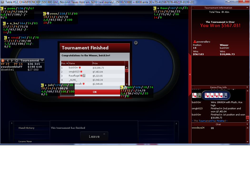 Остальные соперники - какие-то неизвестные интуристы. В основном - тайтовые и прямолинейные до боли. Я понял, что в таких турнирах отлично работает провокация блефа. И в целом, надо побольше исполнять.