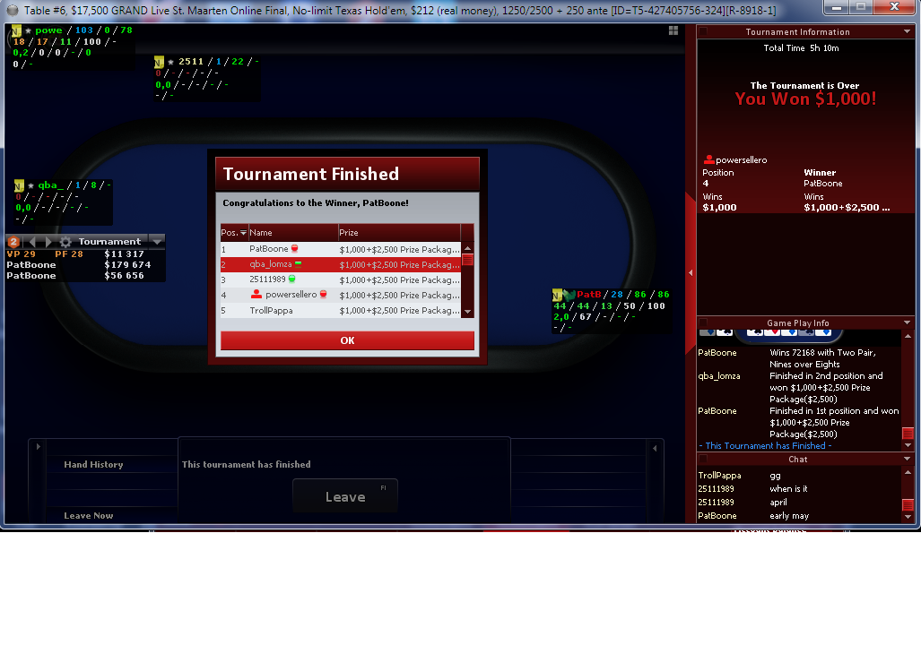 Выводы - кто не рискует, тот не побеждает! Бабушкин покер в таких сателлитах приносит только горечь разочарования. Забавно в них иду, Прага - с первой попытки, Сен-Мартен - с первой, Португалия и Эстония - в пролёте :)
