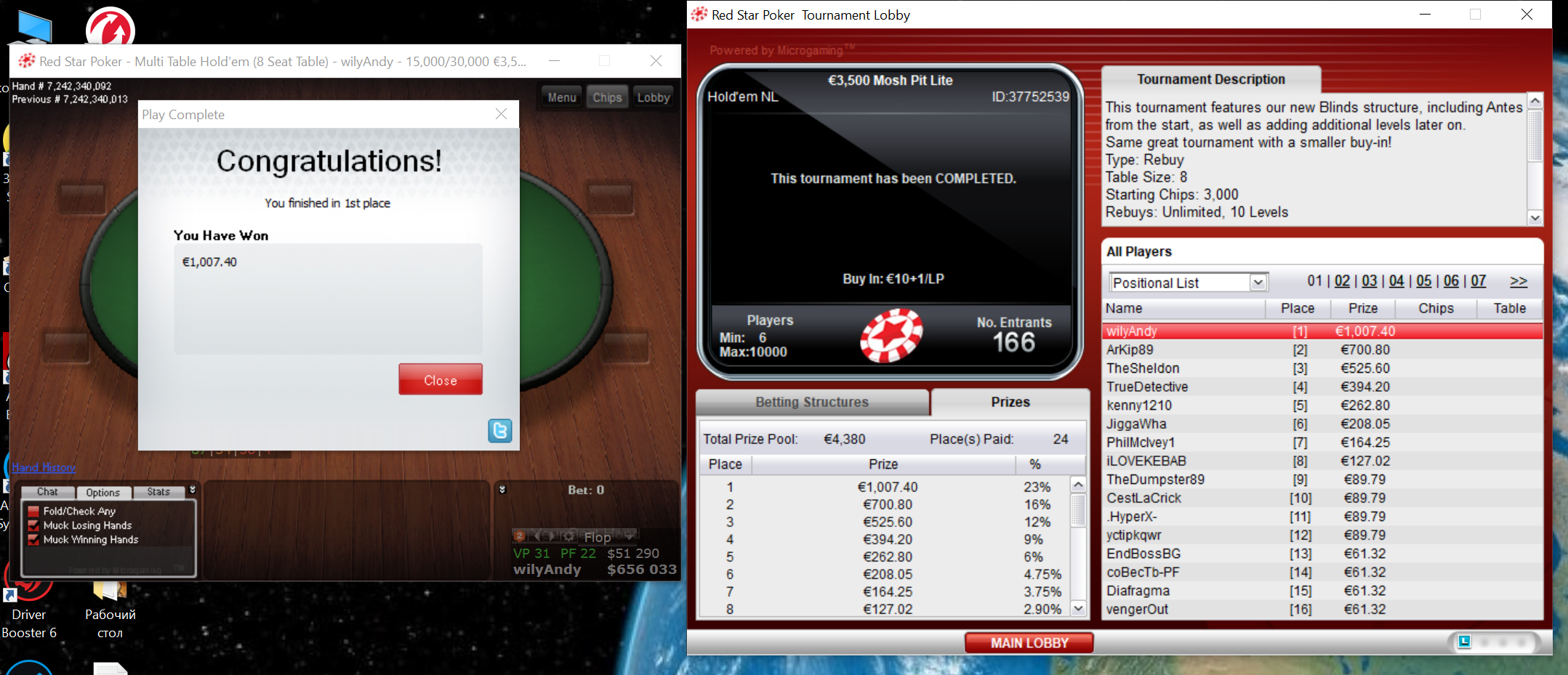 МТТ ребай 11 евро. 2 к гарант. Тащим помаленьку. Выкладывать буду заносы 500+ т.к . турниров где за топ 1 дают 1к + не много. А в будни только 1 и я его не играю пока.