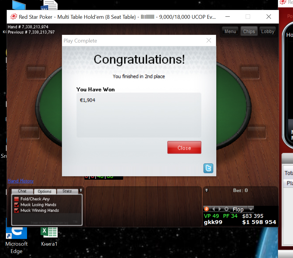 На флопе не думаю что можем упасть, у нас же А хай + бекдорчик. На таком флопе ставка от него ( меня) и с велью и с блефами будет. На терне можно уже упасть, но я не люблю сдаваться (очень). А если не хочется падать, а уж тем более колоть - то идем изображать. Ему есть что повыкидывать тут : 9А, 9Д, 9В, А7,1010, ВВ, ДД, какие-то короли слабые и средние. Думаю, что он должден на терне ставить эти руки, как для велью, так и для защиты от 4-ой червы ну и чтобы получить бесплатный шоудаун в позиции. Да, мы не блочим его флеши. Думаю, что просто попали в его топ диапазон, который ему тяжело выкинуть на этих лимитах. Как такие мысли?