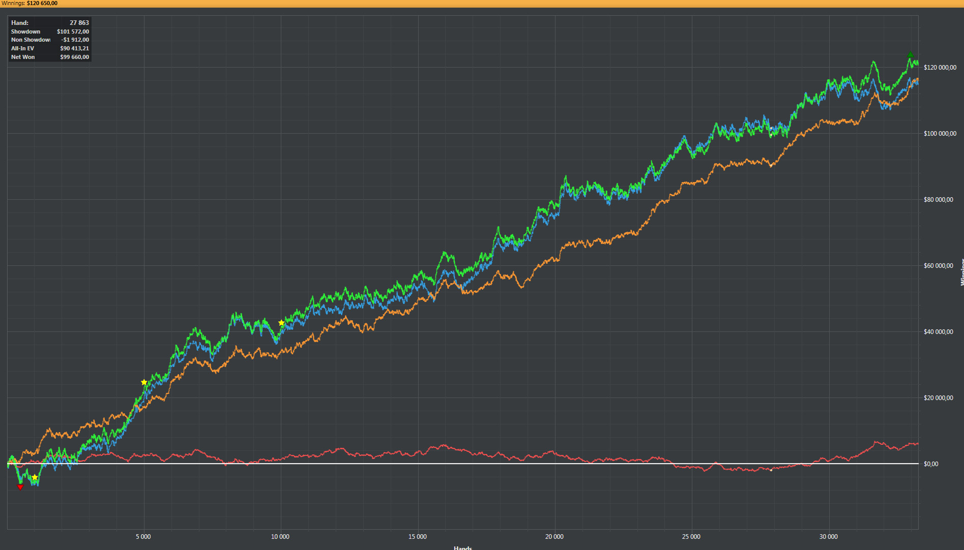 Привет! Можешь максимально подробно рассказать, как этого добился? Я видел твои просадки в этом месяце, и уверен, к сожалению, что на твоем месте я бы тильтанул не раз. И еще, можешь выложить основные статы (VPIP PFR 3Bet) по позициям (BTN SB BB)? Очень интересный у тебя график, обе линии в плюс - я такого в спинах у регов еще не видел. Апостол Павел, апостол Фома
