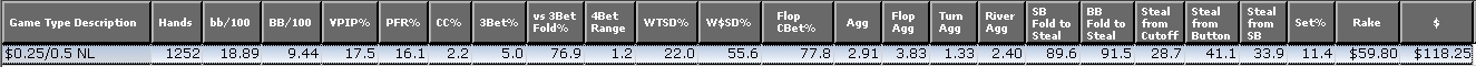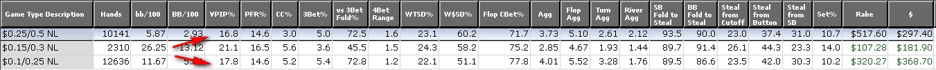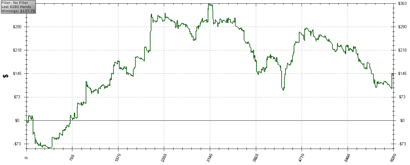 Переход на НЛ50 ознаменовался двумя чудными сессиями, после которых я как обычно решил, что укатываю лимит в асфальт :smoke: Но последующие два дня показали, что не все так однозначно и нужно приводить мозги в порядок, пока не поздно. Но положительные изменения в игре явно есть. Потихоньку выравнивается агрессия на ривере, уменьшается кол-во контбетов - потихоньку начинаю определять куда его стоит лепить, а куда нет. Часто замечаю игру на автомате. Мозг отключается, и не взирая на игру на всего лишь 4 столах, все делается машинально, без размышлений. Встаю играть рано утром, в 6 часов - для меня это нелегко, возможно мозг по утрам тяжело просыпается. Причем как только перешел на лимит, то страх перед ним заставлял играть очень собрано, что давало результаты. Собраться, собраться!