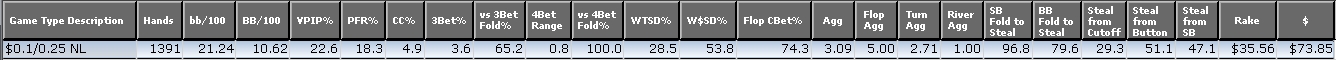 Ну ладно, музычка и поехали... Вот график по утренней сессии. Радует только то, что удается держать довольно высокий уровень VPiP/PFR, что является одной из приоритетных задач. За сегодня статы 23/20, что чуть-чуть выше текущих, которые уверенно держаться 22/18 (нужно чуть их сблизить видимо). Идиотов конечно тоже хватало. Вот парень продемонстрировал чудеса то ли покерной математики, то ли чтения оппонентов. Он отказался добавить 3,7 в пот 40 долл Grabbed byHoldem Manager NL Holdem $0.25(BB) Replayer Hero ($24.75) BB ($18.70) UTG ($31.85) UTG+1 ($23.55) CO ($24.65) BTN ($9.90) Dealt to Hero 9 T![]() fold, fold, fold, fold, Hero raises to $1, BB calls $0.75, FLOP ($2) 7 T T![]() Hero bets $1.25, BB calls $1.25, TURN ($4.50) 7 T T J![]() Hero bets $2.75, BB calls $2.75, RIVER ($10) 7 T T J T![]() Hero bets $5, BB raises to $10, Hero raises to $19.75, BB folds, Hero shows 9 T![]() Hero wins $28.55 Раздачи, в которых больше всего проиграно Grabbed byHoldem Manager NL Holdem $0.25(BB) Replayer SB ($31.70) Hero ($25.15) UTG ($7.15) CO ($34.25) BTN ($26.70) Dealt to Hero A J![]() fold, fold, fold, SB raises to $0.75, Hero raises to $2.50, SB calls $1.75, FLOP ($5) 9 2 J![]() check, Hero bets $3.25, SB raises to $10, Hero calls $6.75, TURN ($25) 9 2 J 5![]() SB bets $13.50, Hero calls $12.65, RIVER ($50.30) 9 2 J 5 7![]() SB shows 9 9![]() (Flop 94.7%, Turn 81.8%) Hero shows A J![]() (Flop 5.3%, Turn 18.2%) SB wins $48.30 Grabbed byHoldem Manager NL Holdem $0.25(BB) Replayer SB ($35.60) Hero ($28.55) UTG ($11.55) CO ($21.20) BTN ($15.40) Dealt to Hero K K![]() UTG calls $0.25, CO calls $0.25, BTN raises to $0.75, SB calls $0.65, Hero raises to $3.75, fold, fold, BTN calls $3, fold, FLOP ($8.75) 2 8 5![]() Hero bets $5, BTN raises to $11.65, Hero calls $6.65, TURN ($32.05) 2 8 5 2![]() RIVER ($32.05) 2 8 5 2 8![]() Hero shows K K![]() (Flop 56.5%, Turn 75.0%) BTN shows Q A![]() (Flop 43.5%, Turn 25.0%) BTN wins $30.50 Grabbed byHoldem Manager NL Holdem $0.25(BB) Replayer SB ($15.35) BB ($7.65) UTG ($25) Hero ($32.70) BTN ($10) Dealt to Hero A 9![]() fold, Hero raises to $1, fold, SB calls $0.90, BB calls $0.75, FLOP ($3) A 5 9![]() check, check, Hero bets $1.50, SB calls $1.50, BB folds, TURN ($6) A 5 9 Q![]() check, Hero bets $3, SB raises to $6, Hero raises to $30.20, SB calls $6.85, RIVER ($31.70) A 5 9 Q 6![]() SB shows A Q![]() (Flop 14.5%, Turn 95.5%) Hero shows A 9![]() (Flop 85.5%, Turn 4.5%) SB wins $30.15 Grabbed byHoldem Manager NL Holdem $0.25(BB) Replayer SB ($16.05) Hero ($24.90) UTG ($25) UTG+1 ($25) CO ($25.35) BTN ($25.90) Dealt to Hero J J![]() fold, UTG+1 raises to $1, fold, BTN calls $1, SB calls $0.90, Hero raises to $5, fold, BTN calls $4, fold, FLOP ($12) 7 K T![]() Hero bets $7, BTN raises to $17.50, Hero folds, BTN wins $24.75 Вроде все по делу, без грубых ошибок ![]() Do your work. Don`t be stupid.