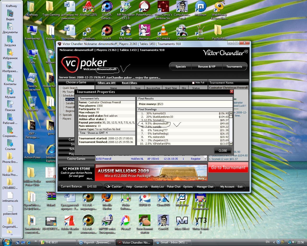 1 не гони. билеты дают абсолютно всем, просто напомни им. кому: tournois@poker770.com тема: tournois Hello, my account PSRхххххххх i'd like to have free tickets to tournaments, as you've mentioned in Promotions. Thanks 2 для россии действительно 7,70 не дают. прочти внимательно письмо, там в единственном числе. и мне тоже не дали, сначала. но показав кое-какие резалты в турнирах, видимо поднялся в ихнем рейтинге, сейчас дали аж 15$. не ждите чуда, чудите сами!