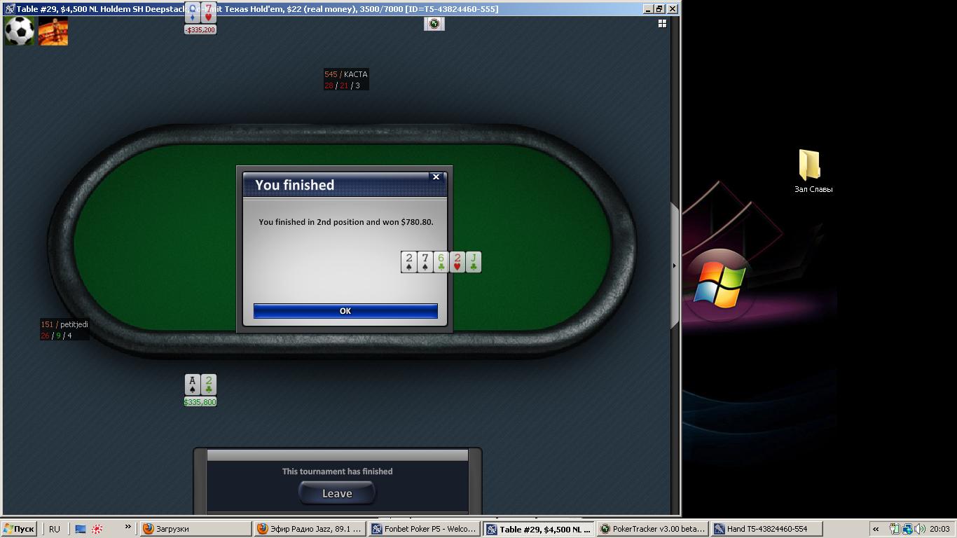 Стек стал около 19к, и дальше ничего интересного не происходило, кроме того, что после блайндов 200-400 я влючил манки-стайл, и начал рейзить все-подряд, благо карта была неплохая, а когда была плохая все выкидывали