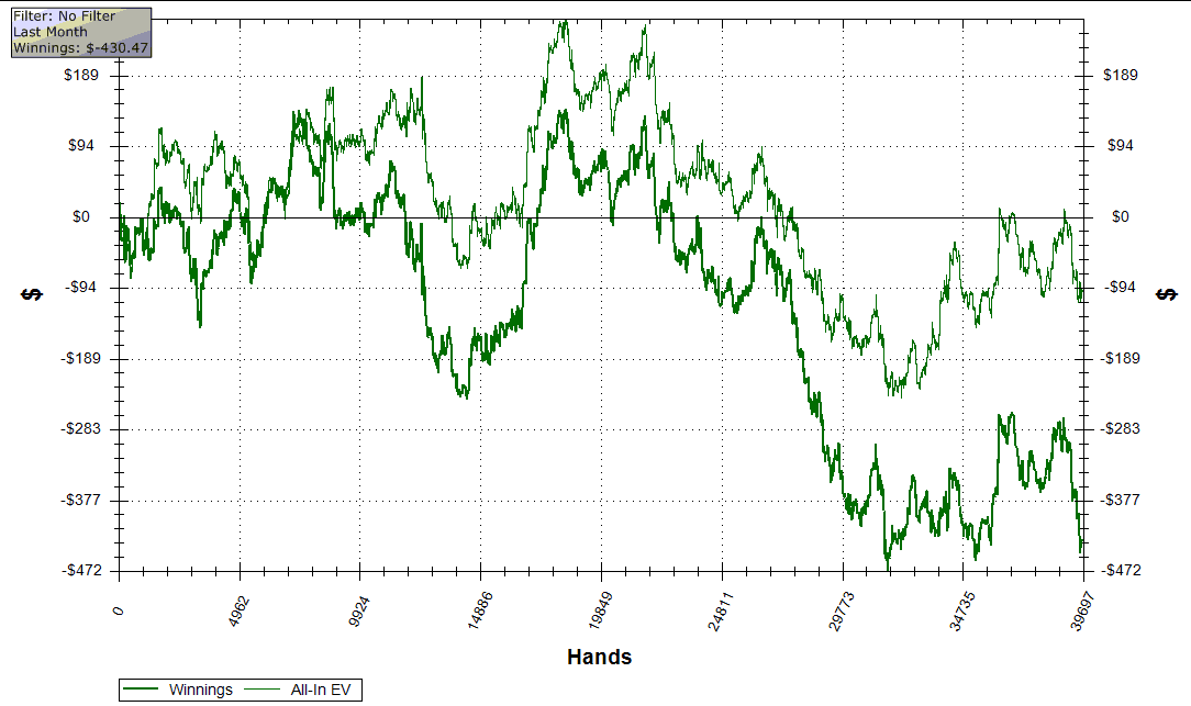 Сам месяц выдался неудачным, особенно последний день - 2 раза попал сет на сет, 2 переезда где у меня было на тернё 90%, 2 стека были проиграны маняьку - первый раз он в трибетпоте поймал трипс троек со своими 38o (он трибетил), второй раз у него оказались тузы против моей пары. И всё это на стек. Итог дня -160.