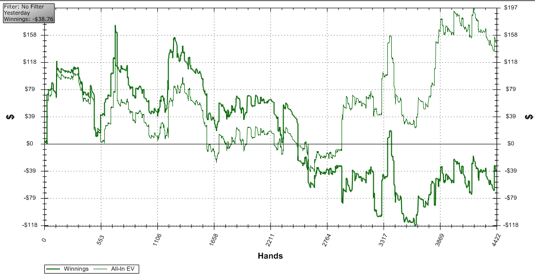 если не везёт, то это надолго. немного поиграл вечером, добавил 20 баксов к счёту фишей. за вечер ничего ниожиданного не случилось, даже выиграл префлоп олин с АА против КК.