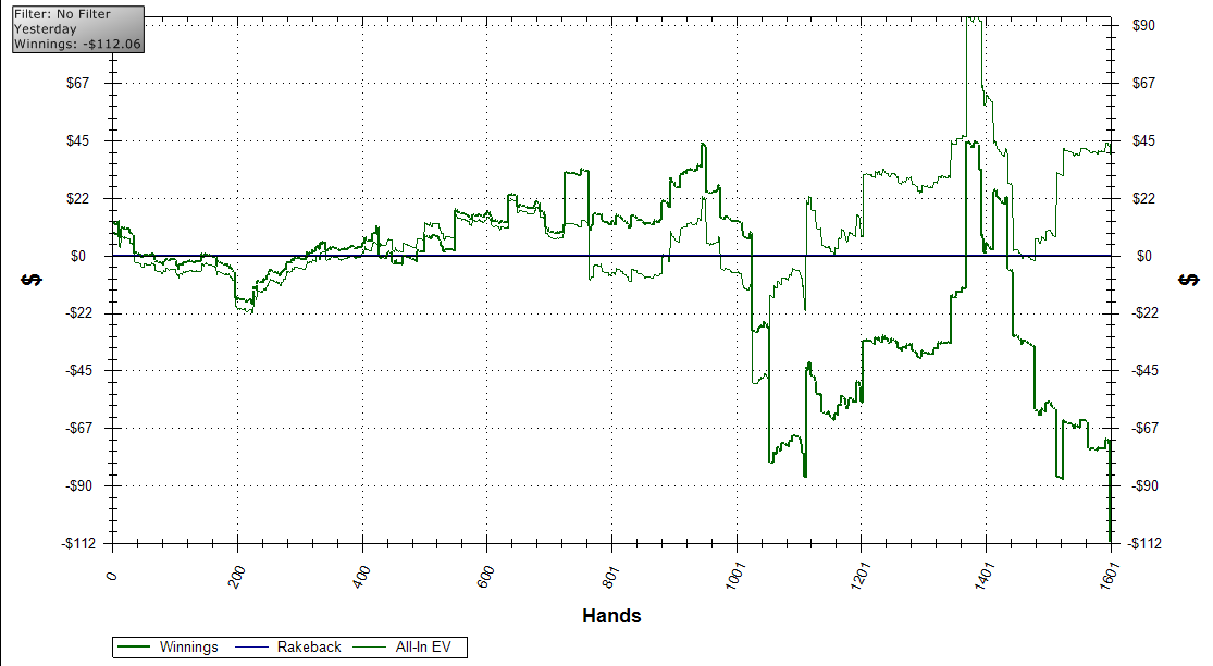 Вчера начал более менее приемлемо, но на последнем столе задержался, там один клоун сидел и кидал оленей на префлопе практически через руку. такую раздачу денег я пропустить не смог и оставил на этом столе больше 5-ти БИ :)