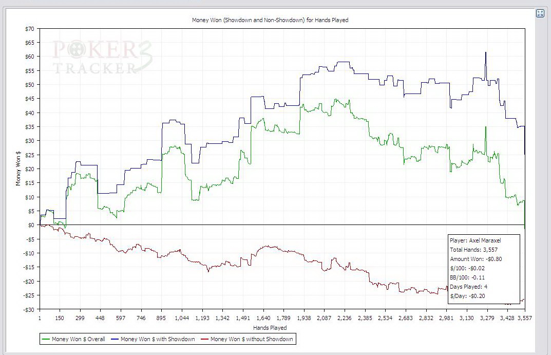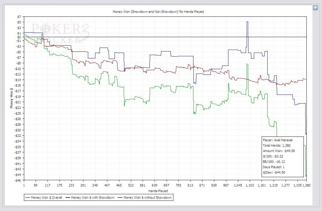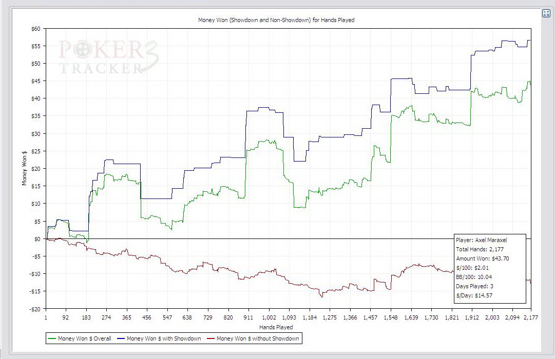 Проснулся раньше будильника - так хотелось играть! :-D Своей игрой остался почти доволен - не понравились две непонятно как разыгранные раздачи (ниже)..Переехали меня один раз всего - полустекер заколлил мой опенрейз с 62 и попал в трипс :-D Такой вот симпатичный получился график: