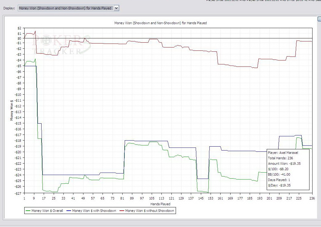Всем привет :)) Плющить меня почти перестало и днем отыграл небольшую сессию в 600 рук - плюс 2 БИ. При этом сделал одну грубую ошибку - зачем-то полез в мультипот с парой дам...причем понимая, что мне там ничего не светит, несмотря, на двух агроморонов, которые ставили гейбеты и до этого разыгрывали совершенно дурацкие руки...В-общем, лишил себя еще одного БИ :(( Должен заметить, что это было почти в начале сессии, когда открыто было около 10 столов...и, глядя на творившуюся за столами вакханалию, я решил после этого оставить 5-6...ну, иначе просто невозможно наблюдать за сплошным экшном - играют агрессивно и лузово, а доходит дело до вскрытия - там самая младшенькая пара...Веселый народ :))