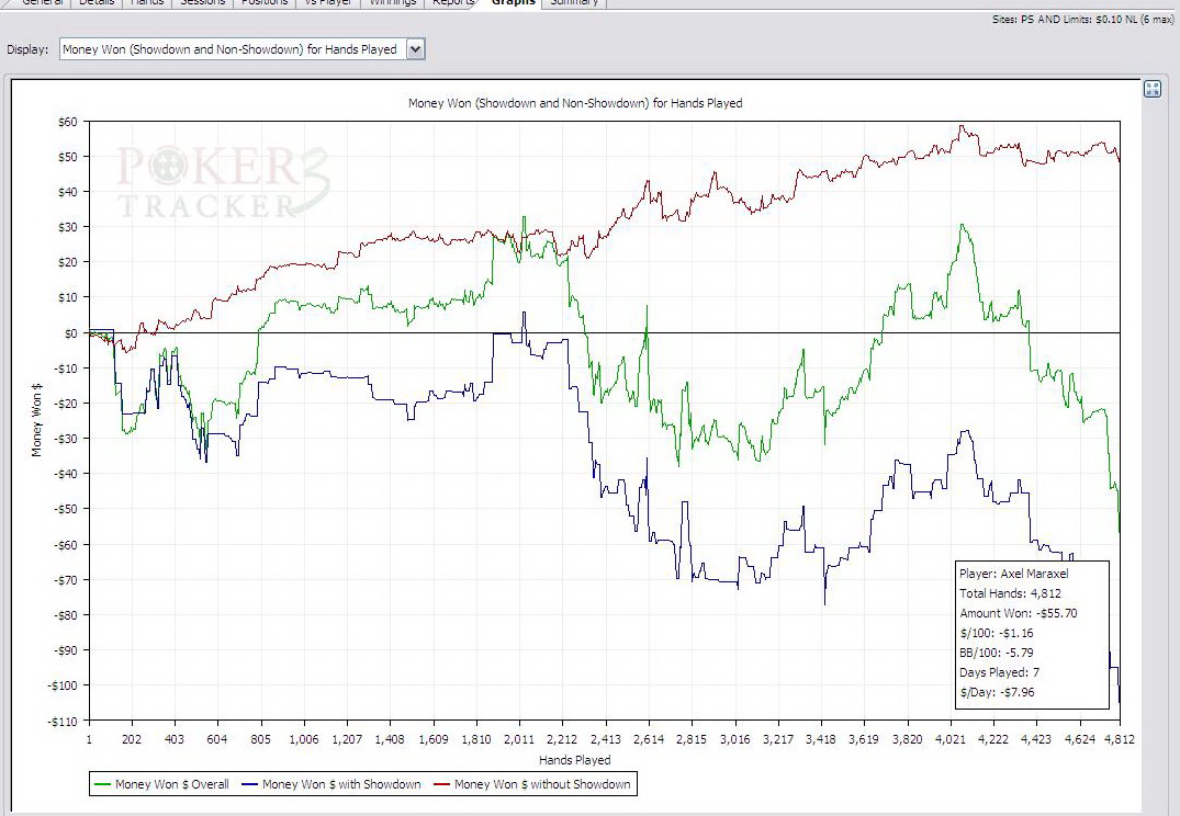 AbirrValG, может быть можно попробывать играть чуть тайтовее? 22/18 нормально, но если сузить префлоп чарт и играть 19/14(ну или где-то рядом) и не лезть в сомнительные раздачи, возможно тогда зелёная линия поползёт вверх? В опщем, если не рассусоливать, идея такая: сыграть несколько сессий в более тайтовом стиле. Это придаст уверенности, а тебе она и нужна. Когда уверенный не так часто переезжают :paratrooper: