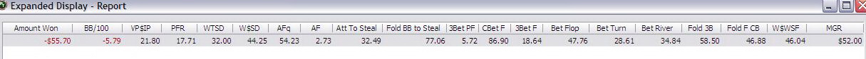 За два дня наиграл 3,8К рук. Начал играть 5 столов. После записи ВОДа, который я отыграл в ноль, оппы посыпались один круче другого - как будто белены объелись, агрессия их просто зашкаливала :eek: блин, играть не давали, и к тому ж какое-то время им перла карта. Ну, пока карта перла я успел около 3 стеков им слить :(( Потом затаился, решил переждать 10 балльный шторм, и начал по одному их отлавливать :-D В-общем, в плюсик сыграл, но уверен, что можно было отыграть еще лучше :up: Счас занимаюсь анализом игры. Да, статы мои получились 17/13, ВТСД 28, агр.2, АТС 24, ФолдТуСтил 70...