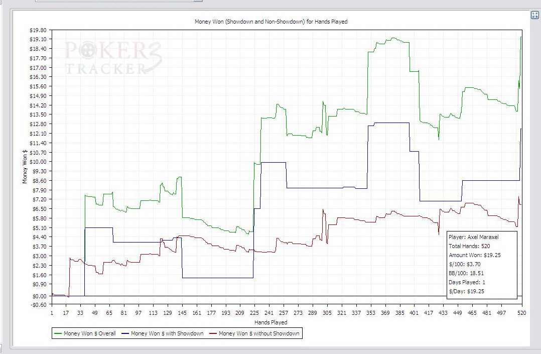 Проснулся раньше будильника - так хотелось играть! :-D Своей игрой остался почти доволен - не понравились две непонятно как разыгранные раздачи (ниже)..Переехали меня один раз всего - полустекер заколлил мой опенрейз с 62 и попал в трипс :-D Такой вот симпатичный получился график: