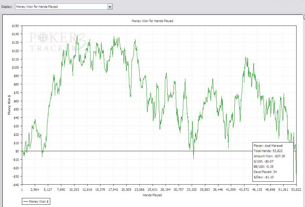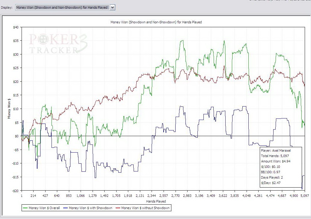 AbirrValG, и еще. У тебя красная линия ну откровенно зашкаливает относительно зеленой и синей. Я не слишком большой специалист (мягко говоря) и уж точно не тренер по покеру, но ИМХО агрессии у тебя перебор. Судя по статам, тебе не хватает гибкости при принятии решений. И, видимо, лезешь до шоудауна со всяким мусором.
