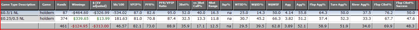 Ну хз, я привык давно на лимитах повыше именно в такой игре основной профит и делать...нравиться мне такая игра, правда обычно, оба стека глубоки, а здесь односторонне было дело... вот хотел выложить, какого черта он меня везунчиком называл? пёрка, то как раз то, у него недетская была... а сколько еще мне пришлось выкинуть на его агрессию, потому как я не мог придумать руки у которой выигрываю, кроме блефа... но потом вырезал побольше статов -вдруг кому интересно -пара то ХАперов сюда заходят изредка: ну и пара раздач, правда не особо интересных, с ним вообще, экшена было много а интересного мало: Grabbed byHoldem Manager NL Holdem $1(BB) Replayer Hero ($194) ($107) Dealt to Hero Q A raises to $3, Hero raises to $11, raises to $107 (AI), Hero calls $96 FLOP ($214) 7 Q J TURN ($214) 7 Q J Q RIVER ($214) 7 Q J Q 5 shows 2 2 (Pre 52%, Flop 8.0%, Turn 4.5%) Hero shows Q A (Pre 48%, Flop 92.0%, Turn 95.5%) Hero wins $213 Grabbed byHoldem Manager NL Holdem $1(BB) Replayer Hero ($302) ($116) Dealt to Hero Q T raises to $3, Hero calls $2 FLOP ($6) 7 T A Hero checks, bets $5, Hero calls $5 TURN ($16) 7 T A 2 Hero checks, bets $12, Hero calls $12 RIVER ($40) 7 T A 2 A Hero checks, bets $40, Hero calls $40 shows 8 9 (Pre 38%, Flop 30.9%, Turn 18.2%) Hero shows Q T (Pre 62%, Flop 69.1%, Turn 81.8%) Hero wins $119 если кто знает его, то передайте что я всегда велком встретиться...поделимся, так как сказать опытом... Судьба играет человеком, а человек играет в покер на трубе. О. Бендер.