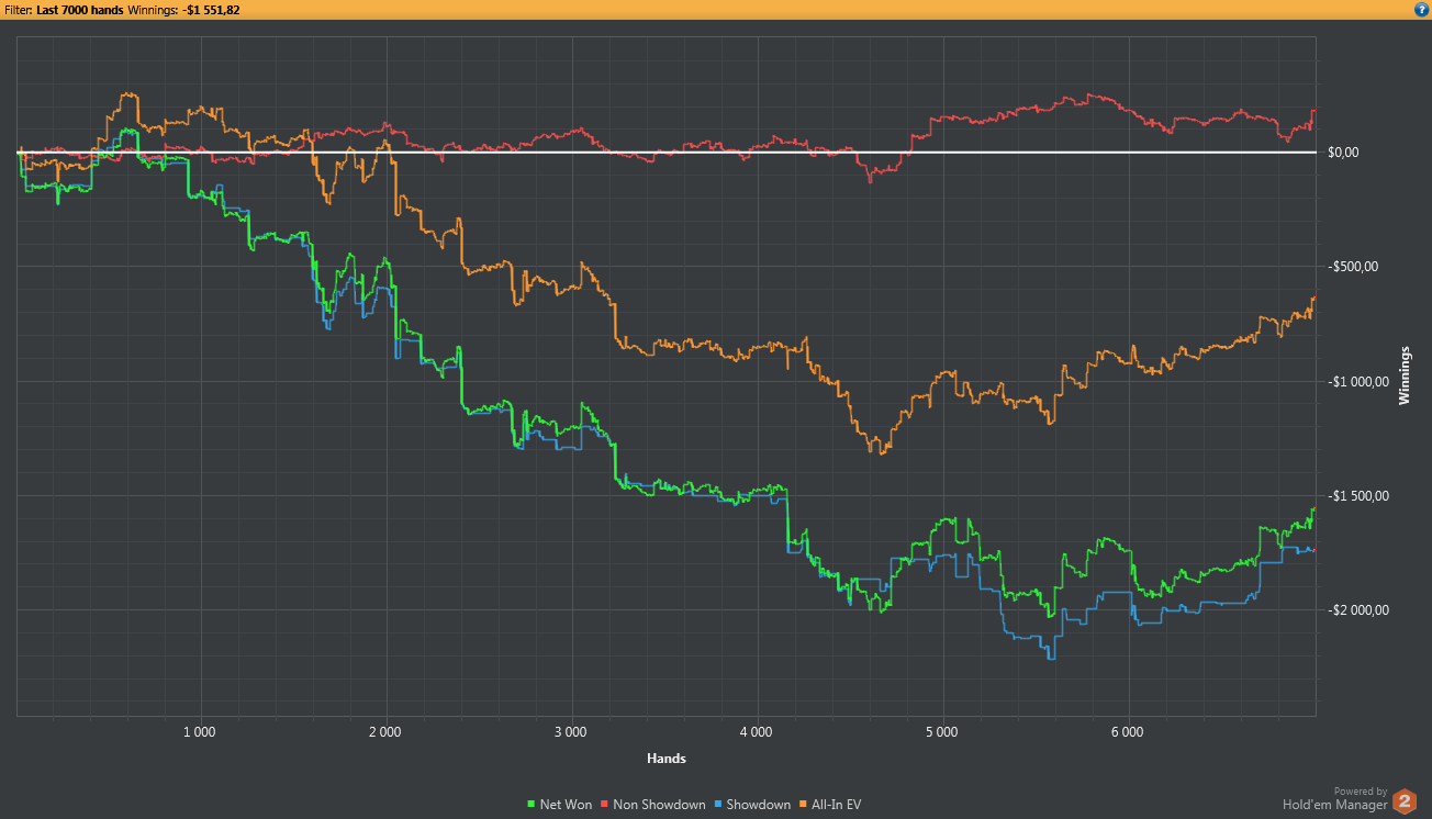количество неприятных раздач, красная медленно обновляет максимумы, по синей минусует частенько. Пока 8бб\100 на 4500 рук $0.50/$1 Zoom No Limit Holdem PokerStars 6 Players Hand Conversion Powered by weaktight.com Stacks: UTG rytmusego ($185.61) 186bb UTG+1 Geconiel ($148.64) 149bb CO 8347046 ($101.50) 102bb BTN McDonky ($104.33) 104bb SB Matthew101 ($103.13) 103bb BB KASPAROV77 ($121.32) 121bb Pre-Flop: ($1.50, 6 players) Geconiel is UTG+1 rytmusego raises to $3, Geconiel raises to $6, 1 fold, McDonky raises to $13, Matthew101 goes all-in $103.13, 1 fold, rytmusego folds, Geconiel folds, McDonky calls $90.13 Flop: ($216.26, 2 players, 1 all-in) Turn: ($216.26, 2 players, 1 all-in) River: ($216.26, 2 players, 1 all-in) Final Pot: $216.26 McDonky shows a pair of Aces Matthew101 shows a pair of Kings McDonky wins $213.46 (net +$110.33) Matthew101 lost $103.13 rytmusego lost $3 Geconiel lost $6 только такие ребята и спасают $0.50/$1 Zoom No Limit Holdem PokerStars 6 Players Hand Conversion Powered by weaktight.com Stacks: UTG sternos ($200.70) 201bb UTG+1 neirfyS ($100) 100bb CO cr1sper ($116.06) 116bb BTN sapfir63rus ($100.21) 100bb SB binliang ($186.14) 186bb BB Geconiel ($129.70) 130bb Pre-Flop: ($1.50, 6 players) Geconiel is BB sternos raises to $3, 2 folds, sapfir63rus raises to $7, 1 fold, Geconiel calls $6, sternos calls $4 Flop: ($21.50, 3 players) Geconiel checks, sternos checks, sapfir63rus bets $9, Geconiel calls $9, sternos folds Turn: ($39.50, 2 players) Geconiel checks, sapfir63rus bets $11, Geconiel raises to $25, sapfir63rus goes all-in $84.21, Geconiel calls $59.21 River: ($207.92, 2 players, 1 all-in) Final Pot: $207.92 sapfir63rus shows high card Ace Geconiel shows a flush, Nine high Geconiel wins $205.12 (net +$104.91) sapfir63rus lost $100.21 sternos lost $7 Раньше, у меня были проблемы с азартными играми......Но теперь, я выигрываю!))