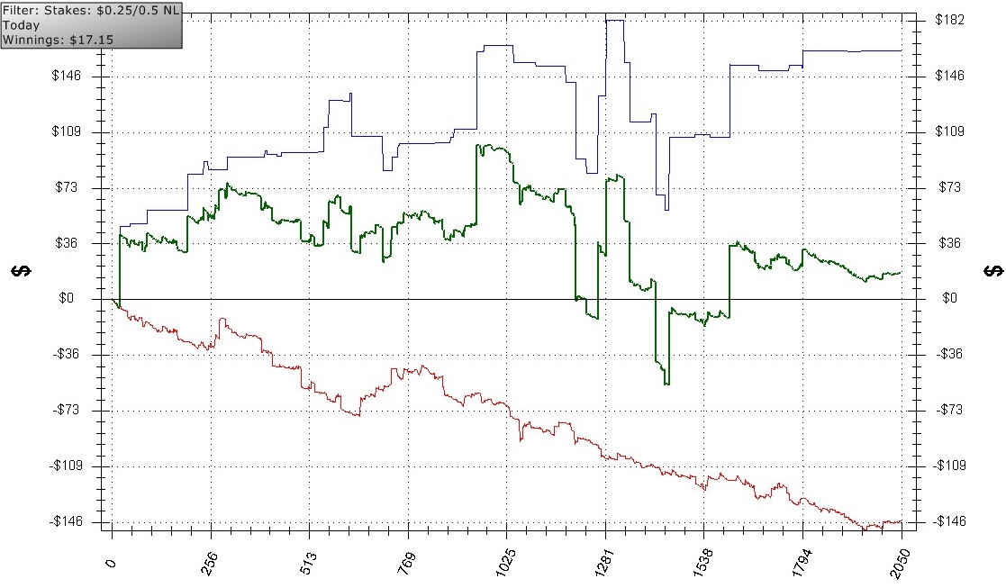 После сегодняшней сессии в голове вообще мыслей не осталось. То что происходило апом уж точно не назвать... Хотя и не даун.. Просто полная задница. Местные реги особо ничем не отличаются от тех что на нл50, разве что сквизить научились... Но рыба... Наверно на нл100 обитает какой-то определенный вид, специально выращенный для этого лимита. Ниже несколько раздач где я был в шоке от того что мне показывали фиши... 1) Grabbed byHoldem Manager NL Holdem $1(BB) Replayer SB ($100) Hero ($100) UTG ($102) UTG+1 ($129) CO ($100) BTN ($111) Dealt to Hero K Q UTG calls $1, fold, fold, fold, SB calls $0.50, Hero raises to $5, UTG calls $4, fold FLOP ($11) 4 K 3 Hero bets $7, UTG raises to $14, Hero calls $7 TURN ($39) 4 K 3 2 Hero checks, UTG bets $27, Hero calls $27 RIVER ($93) 4 K 3 2 2 Hero checks, UTG bets $56.85 (AI), Hero calls $54 (AI) Hero shows K Q (Pre 42%, Flop 69.3%, Turn 79.5%) UTG shows A 2 (Pre 58%, Flop 30.7%, Turn 20.5%) UTG wins $198 2) Grabbed byHoldem Manager NL Holdem $1(BB) Replayer Hero ($100) BB ($106) UTG ($117) CO ($91.75) BTN ($81.80) Dealt to Hero A A fold, fold, BTN calls $1, Hero raises to $5, fold, BTN calls $4 FLOP ($11) 4 4 8 Hero bets $8, BTN calls $8 TURN ($27) 4 4 8 6 Hero checks, BTN checks RIVER ($27) 4 4 8 6 K Hero bets $14.50, BTN raises to $29, Hero calls $14.50 BTN shows 3 K (Pre 15%, Flop 27.3%, Turn 75.0%) Hero shows A A (Pre 85%, Flop 72.7%, Turn 25.0%) BTN wins $82 3) Вельюбечу себе семерку... Grabbed byHoldem Manager NL Holdem $1(BB) Replayer Hero ($108) BB ($72.30) UTG ($107) CO ($103) BTN ($120) Dealt to Hero 7 A fold, fold, fold, Hero raises to $3, BB calls $2 FLOP ($6) 3 5 8 Hero checks, BB checks TURN ($6) 3 5 8 7 Hero bets $3, BB calls $3 RIVER ($12) 3 5 8 7 8 Hero bets $6, BB calls $6 Hero shows 7 A (Pre 31%, Flop 17.6%, Turn 11.4%) BB shows Q Q 4) Ну а после этой раздачи я закрыл столы и ушел... Grabbed byHoldem Manager NL Holdem $1(BB) Replayer SB ($148) BB ($119) Hero ($101) CO ($100) BTN ($120) Dealt to Hero Q A Hero raises to $3, fold, fold, fold, BB calls $2 FLOP ($6.50) Q 4 2 BB bets $5, Hero calls $5 TURN ($16.50) Q 4 2 K BB checks, Hero checks RIVER ($16.50) Q 4 2 K 5 BB bets $7, Hero calls $7 BB shows 8 K (Pre 40%, Flop 16.4%, Turn 88.6%) Hero shows Q A (Pre 60%, Flop 83.6%, Turn 11.4%) BB wins $29 5) Ну и напоследок я хоть где-то выиграл... Grabbed byHoldem Manager NL Holdem $1(BB) Replayer SB ($102) BB ($227) UTG ($100) Hero ($100) CO ($238) BTN ($152) Dealt to Hero K K UTG raises to $3, Hero raises to $10, fold, fold, fold, fold, UTG calls $7 FLOP ($21.50) Q 5 4 UTG checks, Hero bets $10, UTG calls $10 TURN ($41.50) Q 5 4 9 UTG checks, Hero checks RIVER ($41.50) Q 5 4 9 2 UTG checks, Hero bets $22, UTG raises to $80 (AI), Hero calls $58 (AI) UTG shows 6 6 (Pre 18%, Flop 13.2%, Turn 4.5%) Hero shows K K (Pre 82%, Flop 86.8%, Turn 95.5%) Hero wins $198 Если кому-нибудь будет интересно по раздачам - спрашивайте, объясню свои мысли, почему я так сыграл... Шаг назад, два шага вперед. Это не танцы. Это покер.