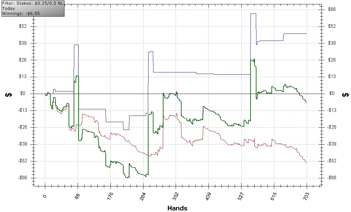 День 3: Все... У меня потекла фляга. Когда игра не приносит удовольствие и денег, то катать нет никакого желания. Жду не дождусь когда март закончится. Научите меня играть кто-нибудь. Ну пожалуйста... Несколько раздач. Не знаю зачем я их выкладываю, но раз уж начал так делать... Grabbed byHoldem Manager NL Holdem $0.50(BB) Replayer SB ($48.40) BB ($100) UTG ($50) Hero ($53.60) BTN ($51.15) Dealt to Hero 6 A fold, Hero raises to $1.50, BTN calls $1.50, SB raises to $3.50, BB calls $3, Hero calls $2, BTN calls $2 FLOP ($14) 3 J 8 SB bets $14, BB calls $14, Hero raises to $50.10 (AI), BTN folds, SB calls $30.90 (AI), BB calls $36.10 TURN ($159) 3 J 8 K RIVER ($159) 3 J 8 K 4 BB shows 9 T (Pre 21%, Flop 21.6%, Turn 14.3%) Hero shows 6 A (Pre 27%, Flop 42.3%, Turn 16.7%) SB shows K K (Pre 51%, Flop 36.1%, Turn 69.0%) Hero wins $10.40 SB wins $145 Раздача против двух фишей Grabbed byHoldem Manager NL Holdem $0.50(BB) Replayer SB ($69.60) BB ($50) Hero ($53.65) CO ($54.05) BTN ($50.60) Dealt to Hero 9 T Hero raises to $1.50, fold, BTN calls $1.50, fold, BB calls $1 FLOP ($4.75) 6 8 4 BB bets $3, Hero raises to $9, BTN raises to $49.10 (AI), BB calls $45.50 (AI), Hero calls $40.10 TURN ($151) 6 8 4 9 RIVER ($151) 6 8 4 9 5 BB shows 5 7 (Pre 28%, Flop 32.2%, Turn 54.8%) Hero shows 9 T (Pre 45%, Flop 32.3%, Turn 23.8%) BTN shows 4 4 (Pre 27%, Flop 35.4%, Turn 21.4%) BB wins $147 BTN wins $1.20 Grabbed byHoldem Manager NL Holdem $0.50(BB) Replayer SB ($69.25) Hero ($50) UTG ($47.90) CO ($61.15) BTN ($49) Dealt to Hero Q Q fold, fold, fold, SB calls $0.25, Hero raises to $2, SB calls $1.50 FLOP ($4) 7 9 8 SB checks, Hero bets $3, SB calls $3 TURN ($10) 7 9 8 4 SB checks, Hero bets $6.50, SB calls $6.50 RIVER ($23) 7 9 8 4 6 SB bets $18, Hero folds SB wins $21.85 И это рег.. Ну что за идиот. Молодец, натянул свое дро. И плевать что не по шансам Grabbed byHoldem Manager NL Holdem $0.50(BB) Replayer SB ($41.70) BB ($76.60) Hero ($73.90) UTG+1 ($52.25) CO ($57.60) BTN ($43.15) Dealt to Hero Q Q Hero raises to $1.50, fold, CO raises to $6, fold, fold, fold, Hero raises to $14.50, CO calls $8.50 FLOP ($29.75) K 7 T Hero bets $7, CO raises to $17, Hero raises to $59.40 (AI), CO calls $26.10 (AI) TURN ($115) K 7 T 7 RIVER ($115) K 7 T 7 9 Hero shows Q Q (Pre 55%, Flop 10.8%, Turn 4.5%) CO shows A K (Pre 45%, Flop 89.2%, Turn 95.5%) CO wins $112 Да, я тупой... Но какого хрена он коллил 4бет? Че за реги на этом лимите... Похоже мне придется заново учиться играть. Я начал думать во время игры и похоже что зря. Очень часто я переоцениваю оппов. Если реги тут коллят 4беты, то как против них можно мувить... А я не могу не мувить, вижу плюсовую ситуацию для блефа и проворачиваю его. Я считаю что опп должен подумать "черт, я тут ничего не бью, фолд", а он думает "черт возьми, да у меня уже два туза! колл" Похоже не на том лимите вые***юсь. Но на другой лимит мне не попасть, пока не побью этот. Буду рад если кто-нибудь поможет мне в этом... -------------------------------------------------------------------------------------------------------------------------------------------------------------- Сыграно 6528 из 30000 |||||||||||||||||||||||||||||||||||||||||||||||||||||||||||||||||||||||||||||||||||||||||| 22% начало: 19.03.10... окончание: 31.03.10 -------------------------------------------------------------------------------------------------------------------------------------------------------------- Итого: --------------------------------- всего рук: 6528 выиграно: -123.00$ винрейт: -3.77bb/100 --------------------------------- Шаг назад, два шага вперед. Это не танцы. Это покер.