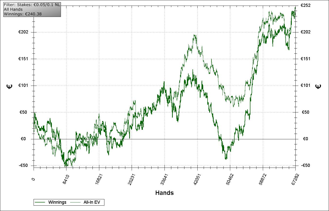 Совсем я забросил дневник. Надо исправляться. Хвастаться хоть и нечем, но пожалуй подведу итоги. Не стал дожидаться 1ого числа и рейкбека и решил вчера вывести весь БР с Энтракшена (жалких 665 евро). С момента последнего графика всё время бил нл20. Не побил: С рейкбеком, конечно, вышел небольшой плюс, но это жалкое утешение. На этом графике и замазочные сессии по 10 часов и 7К рук практически нон-стоп, килограммы тильта и просто говеной игры. И в один прекрасный момент, слив очередные 7 бай-инов в замазке, я понял что с такой дисциплиной мне в жизни не выбраться из минуса. Теперь мои сессии длятся ровно 90 минут, я сажусь катать, завожу будильник и играю до звонка. Хороший способ чтобы не залить лишнего в попытке отмазаться. Буду и дальше так делать до тех пор, пока не научусь сам закрывать столы при первых признаках тильта или усталости. В общем с дисциплиной кое-как разобрался, но говеная игра от этого никуда не делась. Я и за эти полтора часа успевал натворить жести, пытаясь перемувить регуляров: Grabbed byHoldem Manager NL Holdem $0.20(BB) Replayer SB ($19.57) Hero ($20) CO ($30.45) BTN ($27.23) Dealt to Hero K J fold, BTN raises to $0.70, fold, Hero calls $0.50 FLOP ($1.50) T 2 T Hero checks, BTN bets $1.12, Hero raises to $3.44, BTN raises to $6.16, Hero calls $2.72 TURN ($13.82) T 2 T 8 Hero bets $13.14 (AI), BTN calls $13.14 RIVER ($40.10) T 2 T 8 Q BTN shows A T (Pre 58%, Flop 94.9%, Turn 84.1%) Hero shows K J (Pre 42%, Flop 5.1%, Turn 15.9%) BTN wins $38.10 Grabbed byHoldem Manager NL Holdem $0.20(BB) Replayer SB ($23.53) Hero ($22.72) UTG ($21.05) UTG+1 ($4.30) CO ($19.90) BTN ($20.82) Dealt to Hero A J fold, fold, CO raises to $0.57, fold, fold, Hero raises to $2.20, CO raises to $5.03, Hero raises to $22.72 (AI), CO calls $14.87 (AI) FLOP ($39.90) 6 T 7 TURN ($39.90) 6 T 7 3 RIVER ($39.90) 6 T 7 3 7 CO shows Q Q (Pre 69%, Flop 84.8%, Turn 93.2%) Hero shows A J (Pre 31%, Flop 15.2%, Turn 6.8%) CO wins $37.91 Grabbed byHoldem Manager NL Holdem $0.20(BB) Replayer SB ($23.13) BB ($22.01) UTG ($29.70) Hero ($23.60) BTN ($68.01) Dealt to Hero T T UTG raises to $0.70, Hero calls $0.70, fold, fold, fold FLOP ($1.70) 5 4 A UTG bets $1.20, Hero calls $1.20 TURN ($4.10) 5 4 A 9 UTG bets $2.05, Hero raises to $7.10, UTG calls $5.05 RIVER ($18.30) 5 4 A 9 K UTG checks, Hero bets $14.60 (AI), UTG calls $14.60 UTG shows 9 9 (Pre 18%, Flop 8.3%, Turn 77.3%) Hero shows T T (Pre 82%, Flop 91.7%, Turn 22.7%) UTG wins $45.13 Хотя я и не считаю эти раздачи ужасными, это не было тильтовой пиханиной. Но это было как минимум лишнее. По крайней мере на этом лимите. Ну и собрав в сумме всё что я написал + залив без шоудауна, получается график который я выложил выше. Вот такие пироги. (кстати смешная фраза, причем тут пироги вообще?) По изменению игры у меня тоже есть кое-какие мысли, но это уже в другой раз и с другого рума. Недодача за все время игры на нл20 в энтракшене составила 45би, но это тоже жалкое утешение Пусть она там и остается навсегда.Сегодня у нас выпал первый снег... К сожалению когда я проснулся, он уже почти растаял. Но это хороший знак, для того чтобы начать все заново, с чистого, как снег, белого листа. Чем я и постараюсь заняться. Вспомнилась с утра эта песня. Всем удачи, будьте хорошими людьми. Шаг назад, два шага вперед. Это не танцы. Это покер.