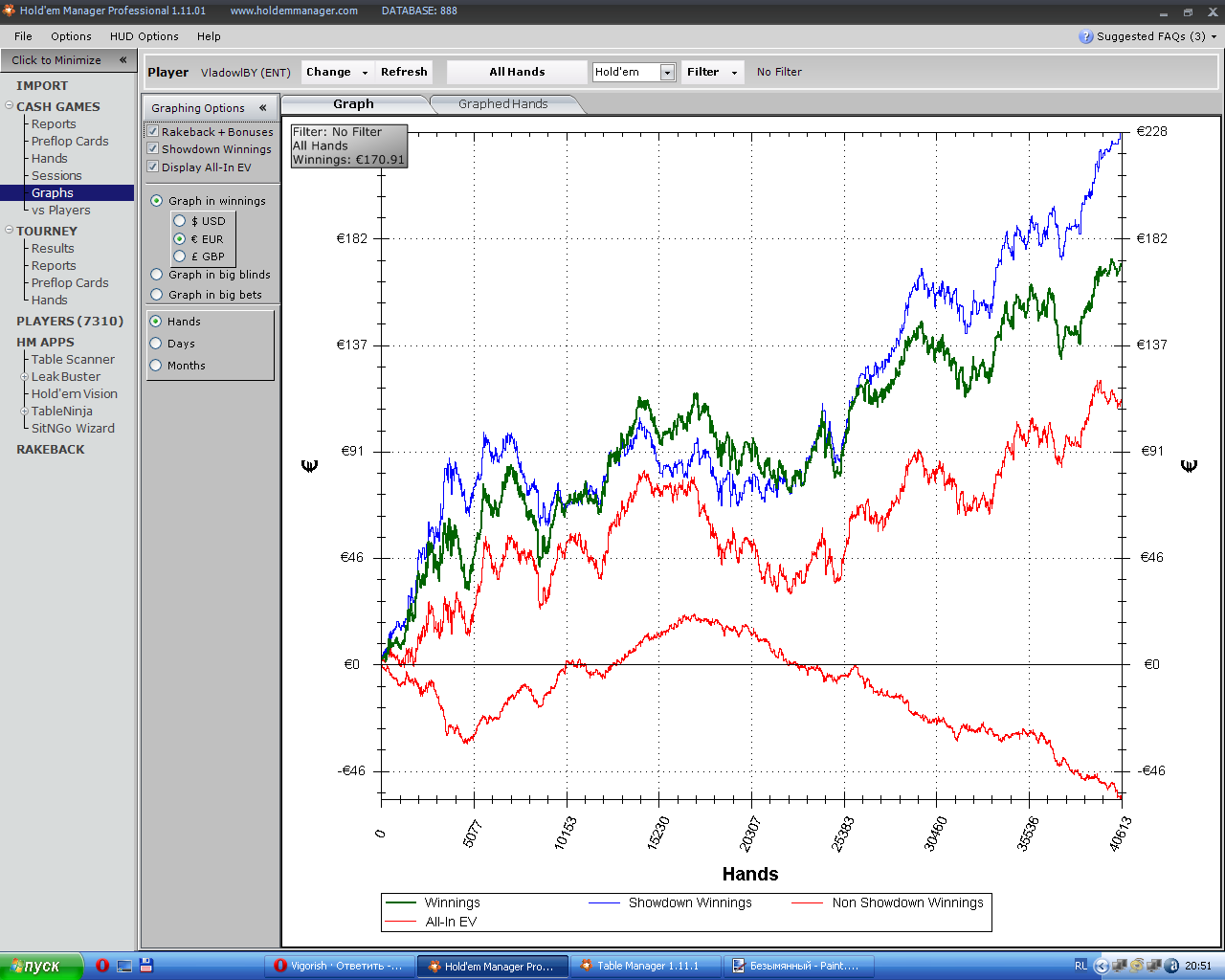 Раздач было очень много спорных, даже через чур... Поэтому захламлять дневник не буду. Одно понял, если верить графику, то чем реже дохожу до шоудауна, тем больше мой банкролл :-D А ещё наверное пати заразил мой комп и и поначалу 22+ и АJ+ ни разу ни попали во флоп :-D . Даже начал немного переживать и входить с 22 до 1010-лимпом. А ещё что бы всякие твари не звонили на трубу и не портили боевой настрой :paratrooper: - вообще б было круто :smoke: :up: Надо по ходу номер сменить :??