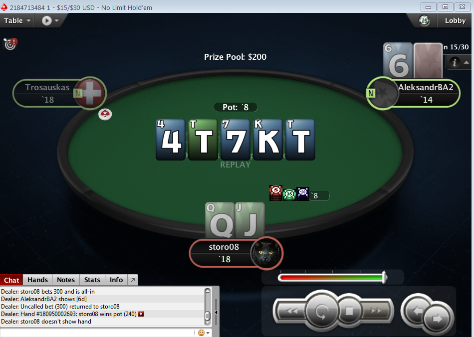Pre Flop: (pot: 1.5 BB) storo08 has T