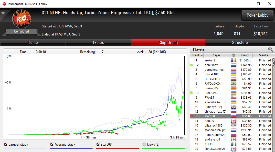 ♠️ Большая игра со storo08 #1 ♠️ WCOOP $530 Total KO, Zoom, HU ♠️ 13.09.2019 ♠️ 22:22 msk ♠️
