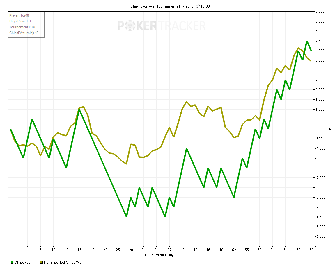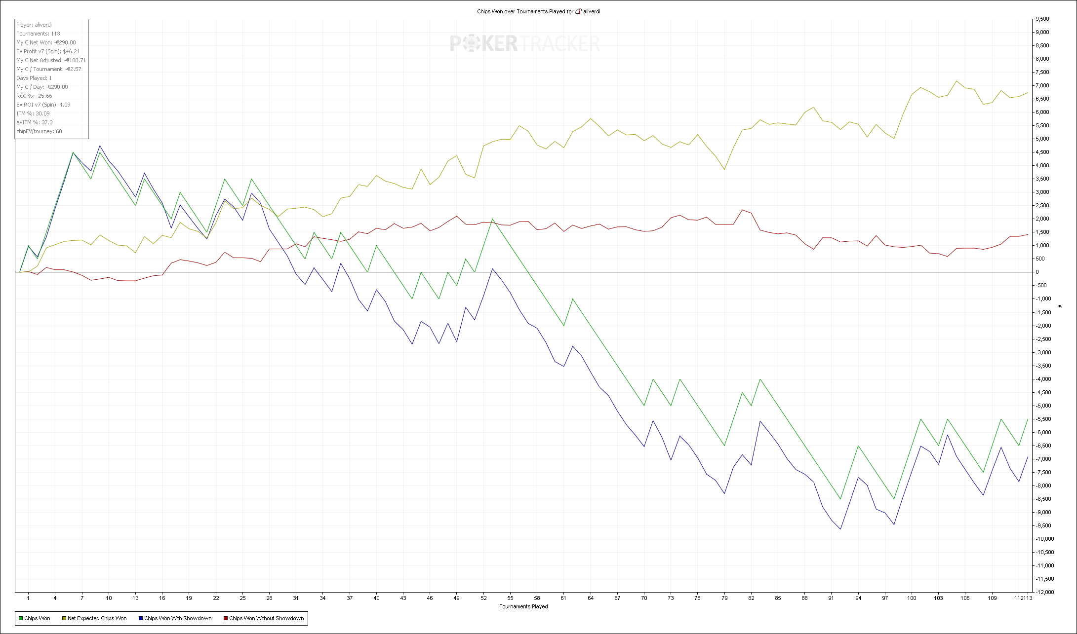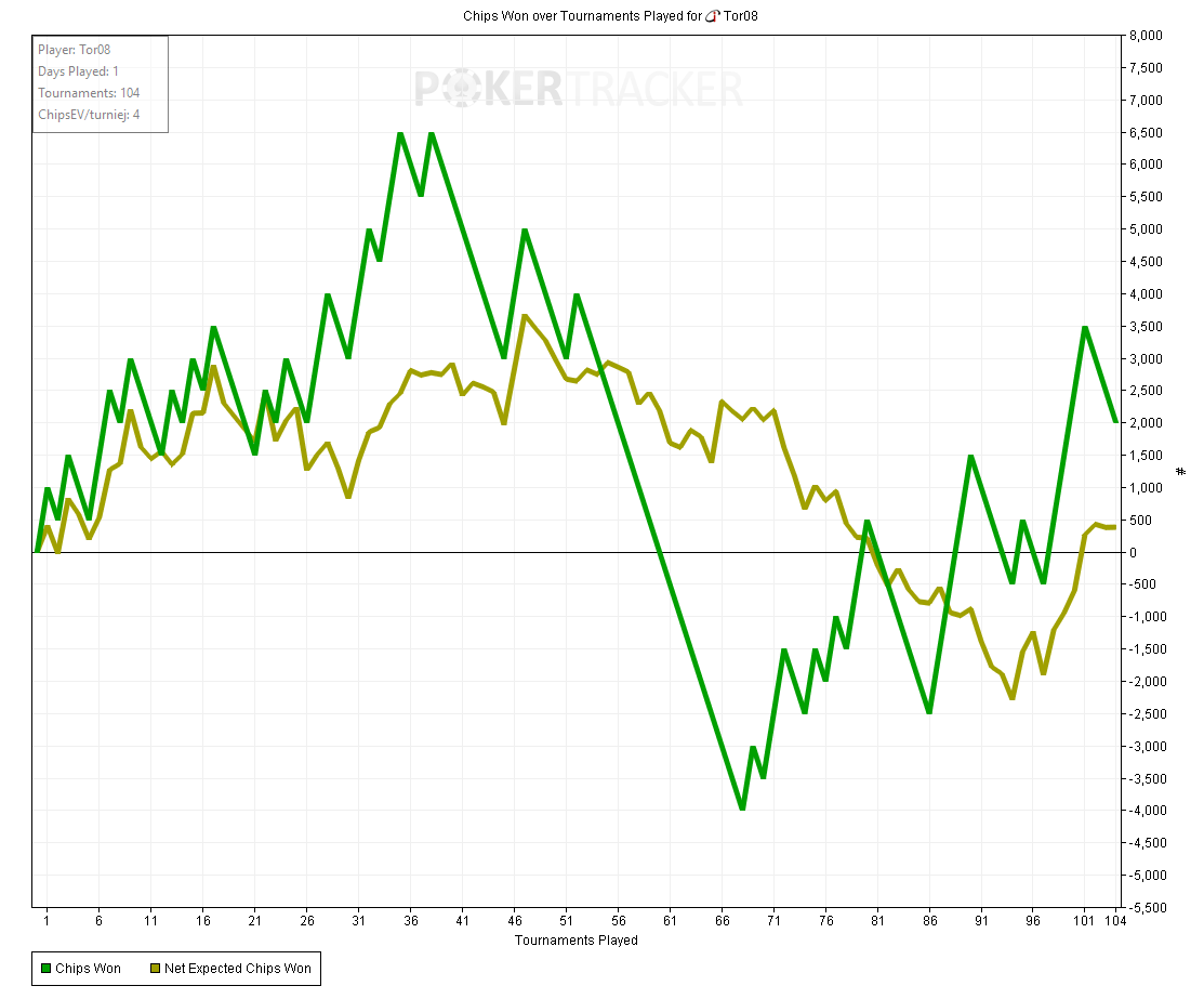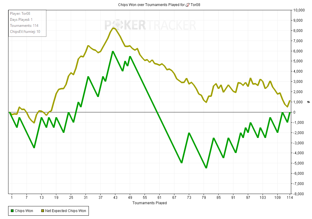 Первые 50 игр до перерыва прошли круто выиграл две х8, шёл в плюсе, с хорошим chip ev, затем стали сдавать что-то невероятное, чего только стоит впечатляющая серия из 21 твистеров, проигранных подряд.
