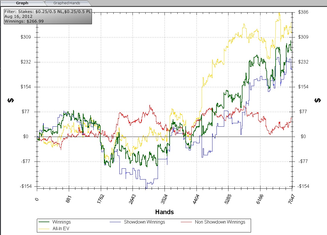 Dealt to Hero K  A fold, fold, fold, MP1 raises to $1.50, fold, Hero calls $1.50, SB calls $1.25, BB calls $1FLOP ($6) Q  T  9 SB checks, BB bets $2.86, MP1 calls $2.86, Hero calls $2.86, SB folds TURN ($14.58) Q  T  9  J BB bets $10.44, MP1 folds, Hero raises to $61.02 (AI), BB calls $35.20 (AI)RIVER ($105) Q  T  9  J  5 Hero shows K  A (Pre 76%, Flop 29.6%, Turn 96.6%) BB shows Q  K (Pre 24%, Flop 70.4%, Turn 3.4%) Hero wins $103 Итоги дня на скриншоте,отыграл порядка 7к рук.Доволен тем что даже красная в плюсе,где то на баин лишний наиграл лузово-агрессивной игрой. Вообще сейчас,много экспериментирую ввожу в игру новые линии или же малопопулярные среди регов.Обо всех не буду рассказывать,но скажу например что теперь изменил бетсайзинг префлоп опенрейзов-с утг-мп3 даю 3 бб,потому что я играю лузово и хочу меньше колов получить когда я вне позиции,с катофа даю 2,5-3бб,с батона даю 2б (!) (про батон чуть ниже расскажу коротко).А если все выкинули и я на малом блайнде,то даю рейз в 3,5бб,потому что если блайнд поколит я буду вне позиции,при игре на смоле,я смотрю на оппа если агрессивный хороший игрок,то плохие руки просто сбрасываю,а если рука достойная например  или там мастевой низкий король типа  и лучшие свои руки открываю в 3,5бб также,таким образом я получаю больше уважения к своему рейзу и получаю больше фолдов,плюс у оппов меньше настроения такой рейз переставлять,вот думаю понятно это. Вот,а по игре с батона опен рейзом в 2бб,это я не давно ввёл в свою практику и играю так более чем 30к рук уже.Для чего?! Дело в том что я повысил свой стиллинг с батона,так как это самая лучшая прибыльная позиция за столом,я хочу воспользоваться ей по максимуму.Мой диапазон открытия близок к 100%,скидываю может самые худшие свои руки,если же сидят тайтеры или неизвестные игроки-я рейжу эни ту,дело в том что, я могу выиграть несколькими способами: 1)я рейз блайнды пас 2)кто то колирует я выблефовываю конбетом и иной раз парой барелей по хорошим тернам/риверам 3)я просто усиливаюсь и выигрываю на шоудауне Ещё когда то,играл в боссмедии и там был один очень хороший рег с Испании с которым мы немного общались на эту тему(я его потом и в старзах видел на nl100),он также играл с 100% рейзом,делая что то типа 2,15 бб рейз. Я решил открывать просто 2 бб. Достоинства открытия в 2бб с батона: 1)Платим небольшую цену рискуем 2 бб,чтоб выиграть 1,5 блайнда. 2)Если кто то потрибетит,мы будем колировать шире так как отношение стеков будет гораздо более глубокое,и при хорошей постфлоп игре,создадим много проблем врагу будучи в позиции. 3)Об этом на самом деле мало кто задумывается,но я считаю это тоже очень важно.Мы даём зайти в игру рукам которые бы сдались сделая мы стандартные 3бб! То есть оппы часто поколят с мусорными руками. То есть часто оппы зайдут с руками имеющими высокие обратно потенциальные шансы-это руки типа Кх,Ах,Qx,то есть с этими руками получив топ пару выиграть большой банк не получится,а вот проиграть большой можно. Недостатки:1)Даем хорошие шансы банка-нас часто будут колировать,иногда даже оба игрока и часто придётся просто сдаваться. 2)Наш рейз будут воспринимать как недорогую попытку стиллинга и будут чаще трибетить(но не все игроки конечно). Подытожу:Достоинства и недостатки этого метода игры тесно между собой переплетаются-то есть да оппы будут чаще нас колить-чаще всего будет заходить биг блайнд,но он будет заходить на не самых хороших руках и ему будет крайне сложно постфлоп.Реалии таковы что многие играют кучу столов и реагируют на такой рейз,также как и на обы