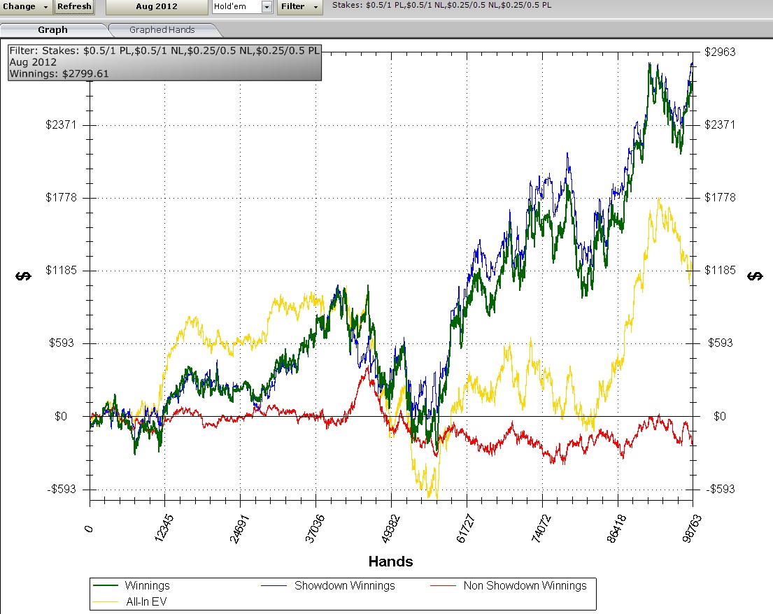 Ну и график в кэш за август.По EV если смотреть,то результат не такой который бы хотелось иметь.Ну будем работать,так как очки набирать теперь не к спеху,в этом месяце 27к набрал,а в последующих трех можно набирать по 19к,ну и что-то поиграю в декабре так и вовсе можно меньше и качественнее играть.Познакомился с двумя регами,один из них очень хорош,надеюсь удастся пообщаться в скайпе,может совместные сессии проведем.Я чувствую что ещё можно подправить свою игру в лучшую сторону.