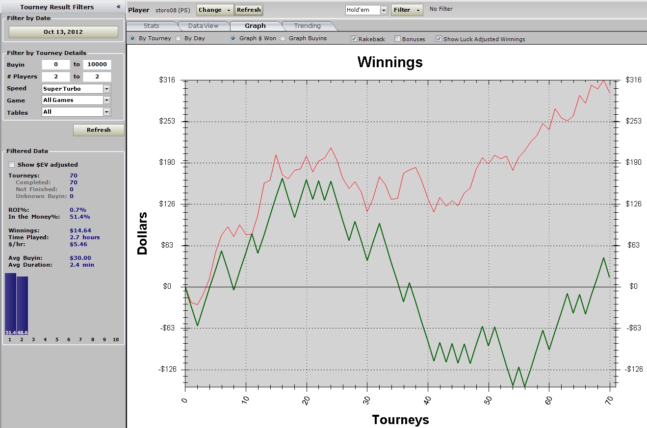 Я же сперва оплатил сет карманными тузами,на сложном дровяном флопе.Затем проиграл два коинфлипа в другом турнире.На этом я не успокоился и открыл покерстарз.Зарядил с десяток турниров байины 10$-44$,куча мелких итм.