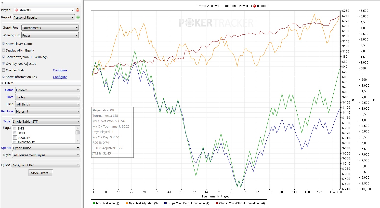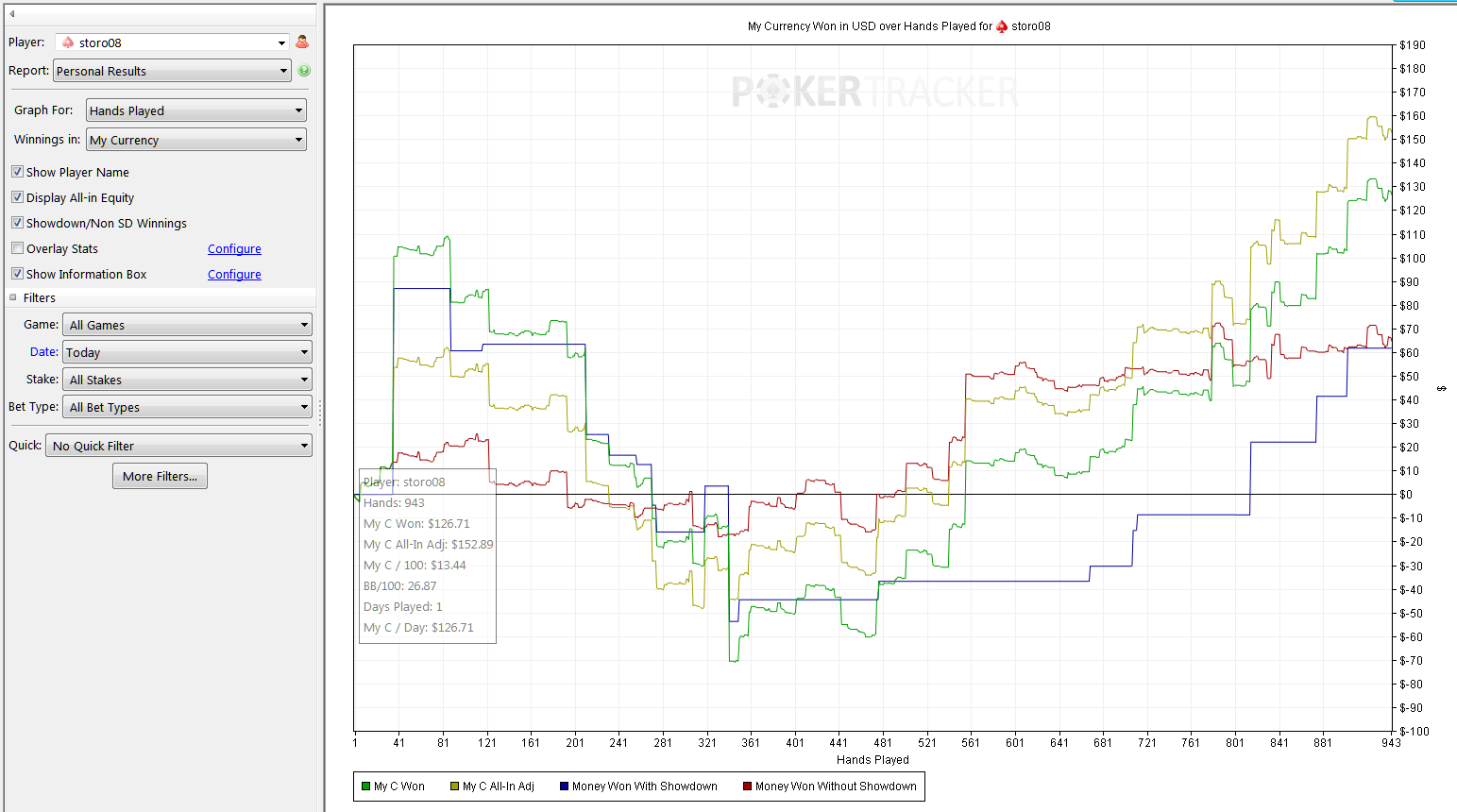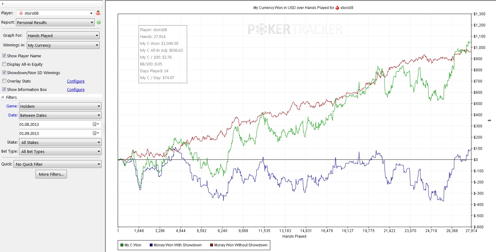 PokerStars - $0.50 NL FAST - Holdem - 9 players Hand converted by PokerTracker 4: http://www.pokertracker.comBTN: 50.56 BB (VPIP: 15.81, PFR: 10.15, 3Bet Preflop: 2.16, Hands: 4,937) SB: 182.94 BB (VPIP: 17.72, PFR: 14.03, 3Bet Preflop: 5.48, Hands: 5,951) Hero (BB): 126.14 BB UTG: 151.5 BB (VPIP: 15.42, PFR: 12.37, 3Bet Preflop: 3.08, Hands: 987) UTG+1: 97.94 BB (VPIP: 18.95, PFR: 8.24, 3Bet Preflop: 1.69, Hands: 445) UTG+2: 100.88 BB (VPIP: 12.23, PFR: 7.19, 3Bet Preflop: 1.59, Hands: 140) MP: 191.14 BB (VPIP: 13.61, PFR: 9.95, 3Bet Preflop: 6.96, Hands: 386) MP+1: 100 BB (VPIP: 12.42, PFR: 4.17, 3Bet Preflop: 1.12, Hands: 1,096) CO: 132.54 BB (VPIP: 11.94, PFR: 11.94, 3Bet Preflop: 0.00, Hands: 67) SB posts SB 0.5 BB, Hero posts BB 1 BB Pre Flop: (pot: 1.5 BB) Hero has Ac Ks fold, UTG+1 calls 1 BB, fold, MP raises to 4 BB, fold, fold, fold, fold, Hero raises to 12.5 BB, fold, MP calls 8.5 BB Flop : (26.5 BB, 2 players) Kc 7s 7d Hero bets 10 BB, MP raises to 33 BB, Hero calls 23 BB Turn : (92.5 BB, 2 players) Jd Hero checks, MP checks River : (92.5 BB, 2 players) 2d Hero bets 19.5 BB, MP calls 19.5 BB Hero shows Ac Ks (Two Pair, Kings and Sevens) (Pre 45%, Flop 92%, Turn 95%) MP mucks 8s 8h (Two Pair, Eights and Sevens) (Pre 55%, Flop 8%, Turn 5%) Hero wins 126.5 BB Тут классическая. Ну ясно, что лимпит фиш, рег изолирует, я всё это дело кручу по творческой руке, и вроде всё хорошо нужны простые фолды от оппов, но упрямый фиш колит, за что наказан постфлоп. PokerStars - $0.50 NL FAST - Holdem - 9 players Hand converted by PokerTracker 4: http://www.pokertracker.comBTN: 128.74 BB (VPIP: 15.52, PFR: 11.67, 3Bet Preflop: 4.12, Hands: 1,859) Hero (SB): 281.52 BB BB: 189.4 BB (VPIP: 12.33, PFR: 8.68, 3Bet Preflop: 8.60, Hands: 221) UTG: 211.86 BB (VPIP: 17.72, PFR: 2.53, 3Bet Preflop: 0.00, Hands: 79) UTG+1: 176.08 BB (VPIP: 12.31, PFR: 9.99, 3Bet Preflop: 6.39, Hands: 3,052) UTG+2: 144.18 BB (VPIP: 11.97, PFR: 9.04, 3Bet Preflop: 3.95, Hands: 380) MP: 48.64 BB (VPIP: 10.65, PFR: 10.30, 3Bet Preflop: 5.05, Hands: 15,816) MP+1: 98.22 BB (VPIP: 12.43, PFR: 4.11, 3Bet Preflop: 1.11, Hands: 1,111) CO: 317.86 BB (VPIP: 46.88, PFR: 15.63, 3Bet Preflop: 7.14, Hands: 33) Hero posts SB 0.5 BB, BB posts BB 1 BB Pre Flop: (pot: 1.5 BB) Hero has Qh 5h fold, fold, fold, fold, fold, CO calls 1 BB, BTN raises to 2.5 BB, Hero raises to 10.5 BB, fold, CO calls 9.5 BB, fold Flop : (24.5 BB, 2 players) 6c 7s Jh Hero bets 12.5 BB, CO calls 12.5 BB Turn : (49.5 BB, 2 players) Qc Hero checks, CO checks River : (49.5 BB, 2 players) 6d Hero bets 18 BB, CO calls 18 BB Hero shows Qh 5h (Two Pair, Queens and Sixes) (Pre 55%, Flop 19%, Turn 89%) CO mucks 9s Js (Two Pair, Jacks and Sixes) (Pre 45%, Flop 81%, Turn 11%) Hero wins 81.66 BB Ну и одна рука из гиперов, назову её как нибудь просто : " Как я рега постфлоп подсобрал". Ривер колил бы любой сразу говорю)) Даже жалко что король доехал по риверу по А-хай красивее была б рука.PokerStars - $29.37+$0.63|15/30 NL (2 max) - Holdem - 2 players Hand converted by PokerTracker 4: http://www.pokertracker.comBB: 19.67 BB (VPIP: 72.22, PFR: 51.52, 3Bet Preflop: 35.29, Hands: 122) Hero (SB): 13.67 BB Hero posts SB 0.5 BB, BB posts BB 1 BB Pre Flop: (pot: 1.5 BB) Hero has Kc Ac Hero calls 0.5 BB, BB checks Flop : (2 BB, 2 players) Ts 3c 5c BB checks, Hero bets 1 BB, BB raises to 2.6 BB, Hero calls 1.6 BB Turn : (7.2 BB, 2 players) 3s BB bets 2.87 BB, Hero calls 2.87 BB River : (12.93 BB, 2 players) Kh BB bets 13.2 BB and is all-in, Hero calls 7.2 BB and is all-in BB shows 2d Jc (One Pair, Threes) (Pre 30%, Flop 14%, Turn 11%) Hero shows Kc Ac (Two Pair, Kings and Threes) (Pre 70%, Flop 86%, Turn 89%) Hero wins 27.33 BB Вообщем 330 с копейками плюсом.