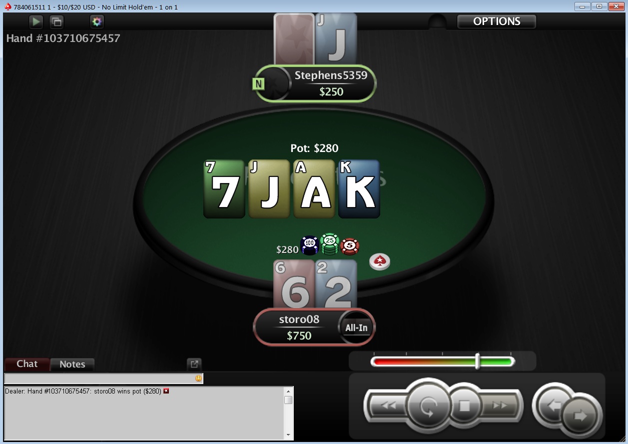 Решил за сегодня отчётик написать. Играл сегодня немного, но продуктивно и качеством показанной игры доволен. Вот гиперы сегодня.Затем решил начать и кэш играть, чуть-чуть поиграл и хватит. Буду потихоньку наращивать обороты в плане игры. Родные 9 макс холдемовские столы как всегда не подвели наличием рыбы) Хотя были и неприяточки типа КК в АА подо все 100бб. Такую втащил из крупных. PokerStars - $0.50 NL FAST - Holdem - 9 players Hand converted by PokerTracker 4: http://www.pokertracker.comBTN: 117.3 BB (VPIP: 11.13, PFR: 8.47, 3Bet Preflop: 2.39, Hands: 4,193) SB: 213.96 BB (VPIP: 17.94, PFR: 14.26, 3Bet Preflop: 5.55, Hands: 5,806) Hero (BB): 103 BB UTG: 80.5 BB (VPIP: 31.73, PFR: 22.08, 3Bet Preflop: 10.27, Hands: 401) UTG+1: 234.16 BB (VPIP: 17.62, PFR: 14.62, 3Bet Preflop: 9.00, Hands: 263) UTG+2: 218.36 BB (VPIP: 30.66, PFR: 10.22, 3Bet Preflop: 5.84, Hands: 369) MP: 95.5 BB (VPIP: 0.00, PFR: 0.00, 3Bet Preflop: 0.00, Hands: 1) MP+1: 146.74 BB (VPIP: 24.77, PFR: 14.76, 3Bet Preflop: 4.52, Hands: 1,638) CO: 98.14 BB (VPIP: 0.00, PFR: 0.00, 3Bet Preflop: 0.00, Hands: 4) SB posts SB 0.5 BB, Hero posts BB 1 BB Pre Flop: (pot: 1.5 BB) Hero has Ks Kd UTG raises to 2 BB, fold, fold, fold, fold, CO raises to 6 BB, fold, fold, Hero raises to 19 BB, UTG calls 17 BB, CO raises to 98.14 BB and is all-in, Hero raises to 103 BB and is all-in, UTG calls 61.5 BB and is all-in Flop : (277.28 BB, 3 players) 2s Jc 6c Turn : (277.28 BB, 3 players) 8h River : (277.28 BB, 3 players) As Hero shows Ks Kd (One Pair, Kings) (Pre 63%, Flop 69%, Turn 86%) UTG mucks 4h 3h (High Card, Ace) (Pre 19%, Flop 18%, Turn 10%) CO mucks Qc Qh (One Pair, Queens) (Pre 18%, Flop 13%, Turn 5%) Hero wins 272.28 BB Ну а тут какой то глупый нит полез на пуховиках куда-то... Думал не выплатит по полной с дамами скажем потому дал крохотный бет.