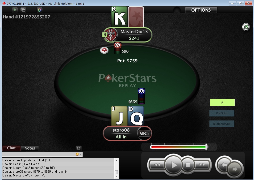 DeucesCracked Poker Videos Hand History Converter Hero (BTN/SB): $85.31 storo08 (BB): $110.57 Pre Flop: ($0.75) Hero is BTN/SB with K K![]() Hero raises to $1, storo08 calls $0.50 Flop: ($2.00) J 5 J (2 players)storo08 checks, Hero bets $0.95, storo08 calls $0.95 Turn: ($3.90) 4 (2 players)storo08 checks, Hero bets $1.86, storo08 calls $1.86 River: ($7.62) 4 (2 players)storo08 checks, Hero bets $6.19, storo08 calls $6.19 Final Pot: $20.00 Hero shows K K (two pair, Kings and Jacks)storo08 shows J T (a full house, Jacks full of Fours)storo08 wins $19.50 (Rake: $0.50) Bet, check, all in в этой ситуации?? |