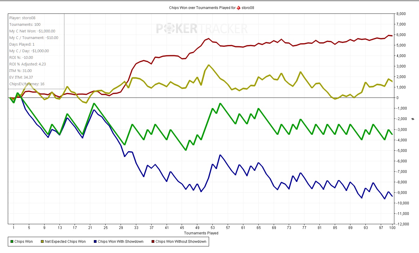 Играем на днях с ним хедзап стаки примрно равные, блайндов по ~25бб, всего лишь х4 (400$)