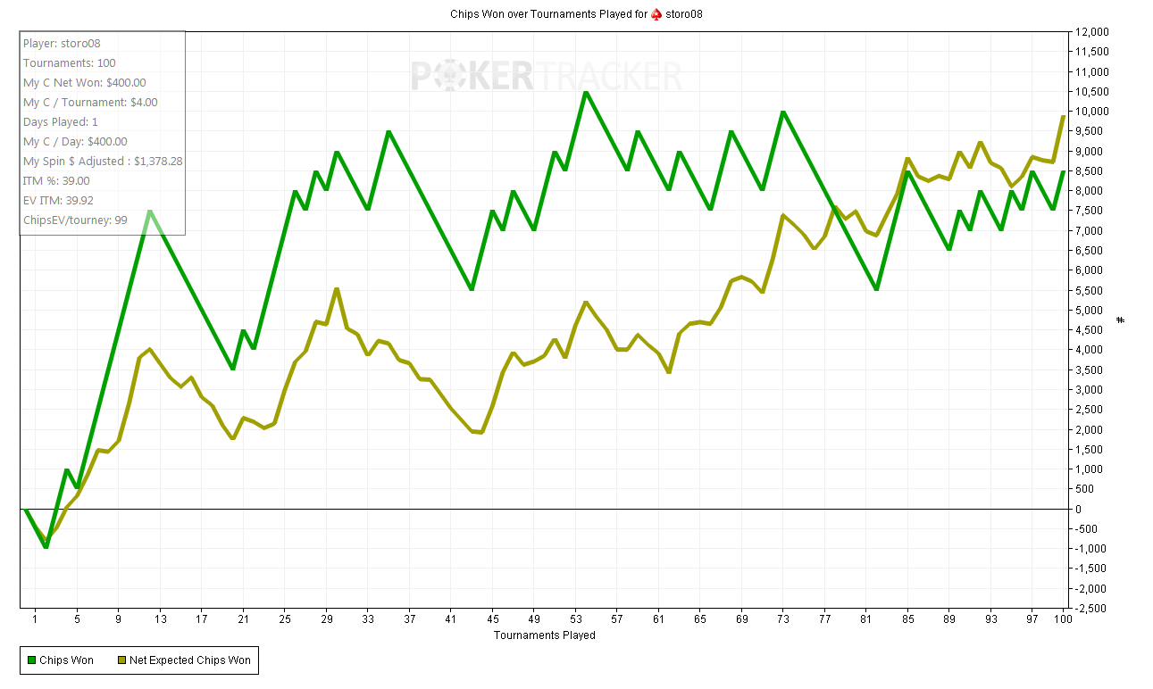 В х6 по прежнему дело дрянь. Кикер играет. PokerStars - $95+$5|20/40 NL (3 max) - Holdem - 2 players Hand converted by PokerTracker 4 Voyage13 (BB): 19.6 BB storo08 (SB): 17.9 BB storo08 posts SB 0.5 BB, Voyage13 posts BB 1 BB Pre Flop: (pot: 1.5 BB) storo08 has 6 8 storo08 calls 0.5 BB, Voyage13 raises to 2 BB, storo08 calls 1 BB Flop: (4 BB, 2 players) 6 3 5 Voyage13 bets 3 BB, storo08 calls 3 BB Turn: (10 BB, 2 players) 2 Voyage13 bets 4 BB, storo08 calls 4 BB River: (18 BB, 2 players) 9 Voyage13 bets 4 BB, storo08 calls 4 BB Voyage13 shows 6 7 (One Pair, Sixes)(Pre 31%, Flop 38%, Turn 16%) storo08 shows 6 8 (One Pair, Sixes)(Pre 69%, Flop 62%, Turn 84%) storo08 wins 26 BB Максимально творческая игра, опп меня здорово напугал, но выкинуть топ-пару я сил не нашёл. PokerStars - $95+$5|20/40 NL (3 max) - Holdem - 2 players Hand converted by PokerTracker 4 Tarkalqsnk (BB): 15 BB storo08 (SB): 22.5 BB storo08 posts SB 0.5 BB, Tarkalqsnk posts BB 1 BB Pre Flop: (pot: 1.5 BB) storo08 has 9 T storo08 calls 0.5 BB, Tarkalqsnk checks Flop: (2 BB, 2 players) 7 6 T Tarkalqsnk checks, storo08 checks Turn: (2 BB, 2 players) A Tarkalqsnk bets 3 BB, storo08 calls 3 BB River: (8 BB, 2 players) 4 Tarkalqsnk bets 11 BB and is all-in, storo08 calls 11 BB Tarkalqsnk shows 4 K (One Pair, Fours)(Pre 54%, Flop 45%, Turn 27%) storo08 shows 9 T (One Pair, Tens)(Pre 46%, Flop 55%, Turn 73%) storo08 wins 30 BB До конца месяца ещё планирую штук 900 сыграть. Не так просто набивать дистанцию совмещая с тренерством. |