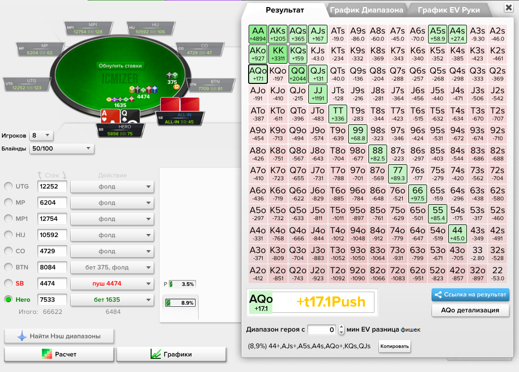 easyd1m, верно, не те блайнды указал, но в расчётах ничего это не меняет, мы же в фишках считаем (проверил вышло тоже самое).