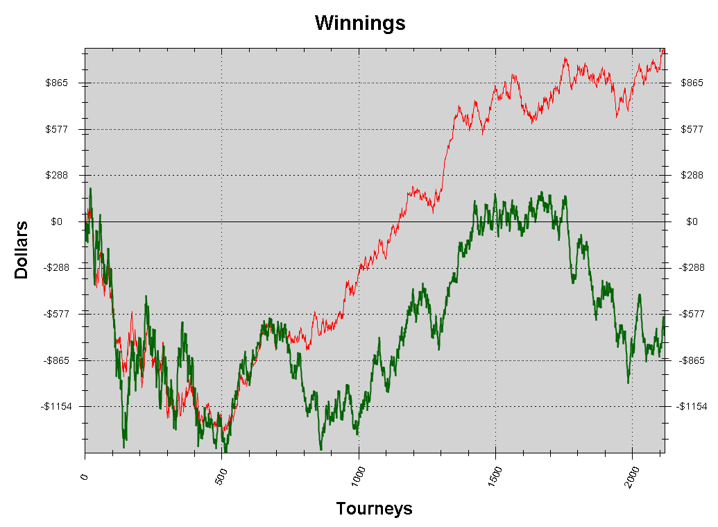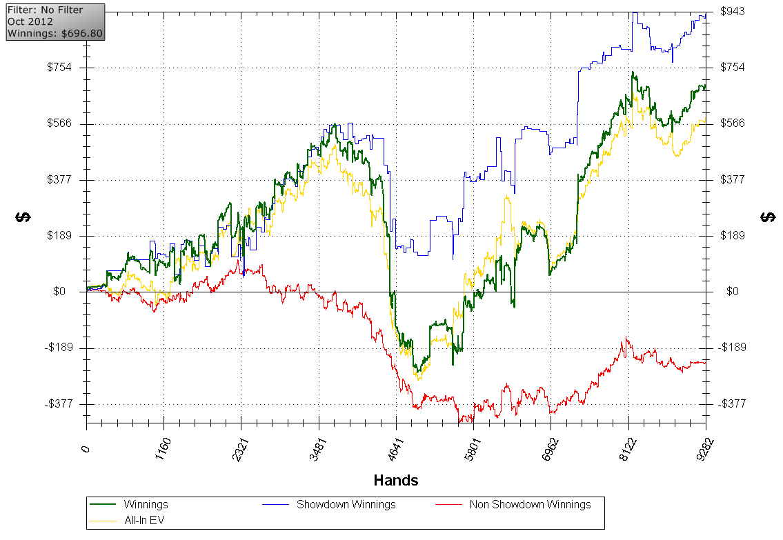 Как итог при своих,наиграл мелочь.Ну я доволен,начинаю месяц не с минуса как обычно. Главное выполнил цель по vpp на день,планировал набрать 1к vpp.Завтра начну играть попозже,так как на nl50 не хочу возиться,чтоб сразу сесть nl100.Если опять игры долго не будет,ну что же придётся добавлять гиперы по 60 в рабочий день. Жирнющий и сладкий рег,что он там бил на тёрне? Grabbed byHoldem Manager NL Holdem $1(BB) Replayer SB ($111) BB ($169) UTG ($135) UTG+1 ($124) UTG+2 ($169) MP1 ($210) MP2 ($102) CO ($89.06) Hero ($123) Dealt to Hero Q Q UTG raises to $3, fold, fold, fold, fold, fold, Hero calls $3, fold, fold FLOP ($7.50) K 5 9 UTG bets $5, Hero calls $5 TURN ($17.50) K 5 9 Q UTG bets $11, Hero raises to $27.50, UTG raises to $127 (AI), Hero calls $88.09 (AI) RIVER ($248) K 5 9 Q 5 Hero shows Q Q (Pre 18%, Flop 10.0%, Turn 95.5%) UTG shows A A (Pre 82%, Flop 90.0%, Turn 4.5%) Hero wins $245 Лузовая игра.Опп защищал девочку на танке,ну у а меня была девушка на парне,тоже пришлось защищать. Grabbed byHoldem Manager NL Holdem $0.50(BB) Replayer SB ($110) Hero ($50) UTG ($49.25) UTG+1 ($32) UTG+2 ($56.42) MP1 ($96.81) MP2 ($29.93) CO ($86.14) BTN ($36.05) Dealt to Hero Q J fold, fold, fold, fold, fold, fold, fold, SB raises to $1.25, Hero calls $0.75 FLOP ($2.50) K 6 5 SB bets $1.50, Hero calls $1.50 TURN ($5.50) K 6 5 K SB bets $3.50, Hero calls $3.50 RIVER ($12.50) K 6 5 K 9 SB bets $7, Hero calls $7 SB shows Q 2 (Pre 30%, Flop 21.5%, Turn 13.6%) Hero shows Q J (Pre 70%, Flop 78.5%, Turn 86.4%) Hero wins $25.31 Больше никакие руки выкладывать не хочется.Подведу итоги дня. Итог дня(7330 hands nl50/nl100 zoom): +18$ vpp: +1141 ![]() |