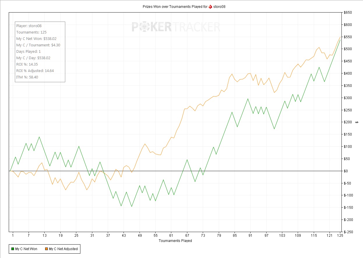 Чутка сдач. Вот так вот любит народ блефовать в никуда. PokerStars - $29.37+$0.63|10/20 NL (2 max) - Holdem - 2 players Hand converted by PokerTracker 4 BB: 27.15 BB (VPIP: 85.71, PFR: 71.43, 3Bet Preflop: 33.33, Hands: 7) Hero (SB): 22.85 BB Hero posts SB 0.5 BB, BB posts BB 1 BB Pre Flop: (pot: 1.5 BB) Hero has 8 A Hero raises to 2 BB, BB calls 1 BB Flop: (4 BB, 2 players) A 3 8 BB checks, Hero bets 1.6 BB, BB raises to 5.1 BB, Hero calls 3.5 BB Turn: (14.2 BB, 2 players) J BB bets 5.35 BB, Hero calls 5.35 BB River: (24.9 BB, 2 players) 5 BB bets 14.7 BB and is all-in, Hero calls 10.4 BB and is all-in BB shows 4 Q (High Card, Ace) (Pre 41%, Flop 2%, Turn 0%)Hero shows 8 A (Two Pair, Aces and Eights) (Pre 59%, Flop 98%, Turn 100%)Hero wins 45.7 BB Тут вообще всё весело. PokerStars - $29.37+$0.63|10/20 NL (2 max) - Holdem - 2 players Hand converted by PokerTracker 4 BB: 27.5 BB (VPIP: 100.00, PFR: 100.00, 3Bet Preflop: -, Hands: 3) Hero (SB): 22.5 BB Hero posts SB 0.5 BB, BB posts BB 1 BB Pre Flop: (pot: 1.5 BB) Hero has K J Hero raises to 2 BB, BB raises to 7 BB, Hero calls 5 BB Flop: (14 BB, 2 players) T A A BB bets 7 BB, Hero calls 7 BB Turn: (28 BB, 2 players) 2 BB bets 6 BB, Hero raises to 8.5 BB and is all-in, fold Hero wins 40 BB Тут фиш, флоп флоатил против 4ки, случайных карт. Ну и как это обычно бывает план изменился с приходом натса и пришлось добирать. PokerStars - $29.37+$0.63|10/20 NL (2 max) - Holdem - 2 players Hand converted by PokerTracker 4 BB: 24.5 BB (VPIP: 88.00, PFR: 37.50, 3Bet Preflop: 0.00, Hands: 27) Hero (SB): 25.5 BB Hero posts SB 0.5 BB, BB posts BB 1 BB Pre Flop: (pot: 1.5 BB) Hero has T J Hero raises to 2 BB, BB calls 1 BB Flop: (4 BB, 2 players) Q 4 Q BB bets 1 BB, Hero calls 1 BB Turn: (6 BB, 2 players) A BB bets 2 BB, Hero raises to 5 BB, BB calls 3 BB River: (16 BB, 2 players) K BB checks, Hero bets 17.5 BB and is all-in, BB calls 16.5 BB and is all-in Hero shows T J (Straight, Ace High) (Pre 31%, Flop 15%, Turn 13%)BB shows K T (Two Pair, Kings and Queens) (Pre 69%, Flop 85%, Turn 88%)Hero wins 49 BB Два рега сегодня так конкретно меня подоставали, этого удалось наказать, выиграл у него 4 подряд и ушёл на перерыв. Хорошо он меня вскрыл. PokerStars - $29.37+$0.63|10/20 NL (2 max) - Holdem - 2 players Hand converted by PokerTracker 4 SB: 25 BB (VPIP: 85.42, PFR: 63.83, 3Bet Preflop: 50.00, Hands: 52) Hero (BB): 25 BB SB posts SB 0.5 BB, Hero posts BB 1 BB Pre Flop: (pot: 1.5 BB) Hero has A K SB raises to 2 BB, Hero raises to 4.5 BB, SB calls 2.5 BB Flop: (9 BB, 2 players) T 2 A Hero bets 3 BB, SB calls 3 BB Turn: (15 BB, 2 players) 8 Hero bets 5 BB, SB calls 5 BB River: (25 BB, 2 players) 8 Hero bets 12.5 BB and is all-in, SB calls 12.5 BB and is all-in Hero shows A K (Two Pair, Aces and Eights) (Pre 65%, Flop 86%, Turn 84%)SB shows J Q (One Pair, Eights) (Pre 35%, Flop 14%, Turn 16%)Hero wins 50 BB А тут турок, сыграл с ним наверное матчей 20 сегодня, не по своей воле, т.к. игра с регами на 30ках мне не особо то и нужна. По ев я с ним иду +1 баин, а вот по профиту проигрываю 7. Здесь имел место наилегчайший колл на реке. PokerStars - $29.37+$0.63|15/30 NL (2 max) - Holdem - 2 players Hand converted by PokerTracker 4 BB: 19 BB (VPIP: 77.61, PFR: 50.52, 3Bet Preflop: 40.00, Hands: 223) Hero (SB): 14.33 BB Hero posts SB 0.5 BB, BB posts BB 1 BB Pre Flop: (pot: 1.5 BB) Hero has 5 K Hero raises to 2 BB, BB calls 1 BB Flop: (4 BB, 2 players) 9 T 5 BB checks, Hero checks Turn: (4 BB, 2 players) 2 BB bets 3 BB, Hero calls 3 BB River: (10 BB, 2 players) A BB bets 14 BB and is all-in, Hero calls 9.33 BB and is all-in BB shows Q 6 (High Card, Ace) (Pre 40%, Flop 25%, Turn 14%)Hero shows 5 K (One Pair, Fives) (Pre 60%, Flop 75%, Turn 86%)Hero wins 28.67 BB Сессия довольно плотная вышла + сыграл по традиции 4ху мтт, в двух из них доехал в мелкие ИТМ. Итог дня: + 540$ Вот так всё быстро меняется в гипертурбо. ![]() |