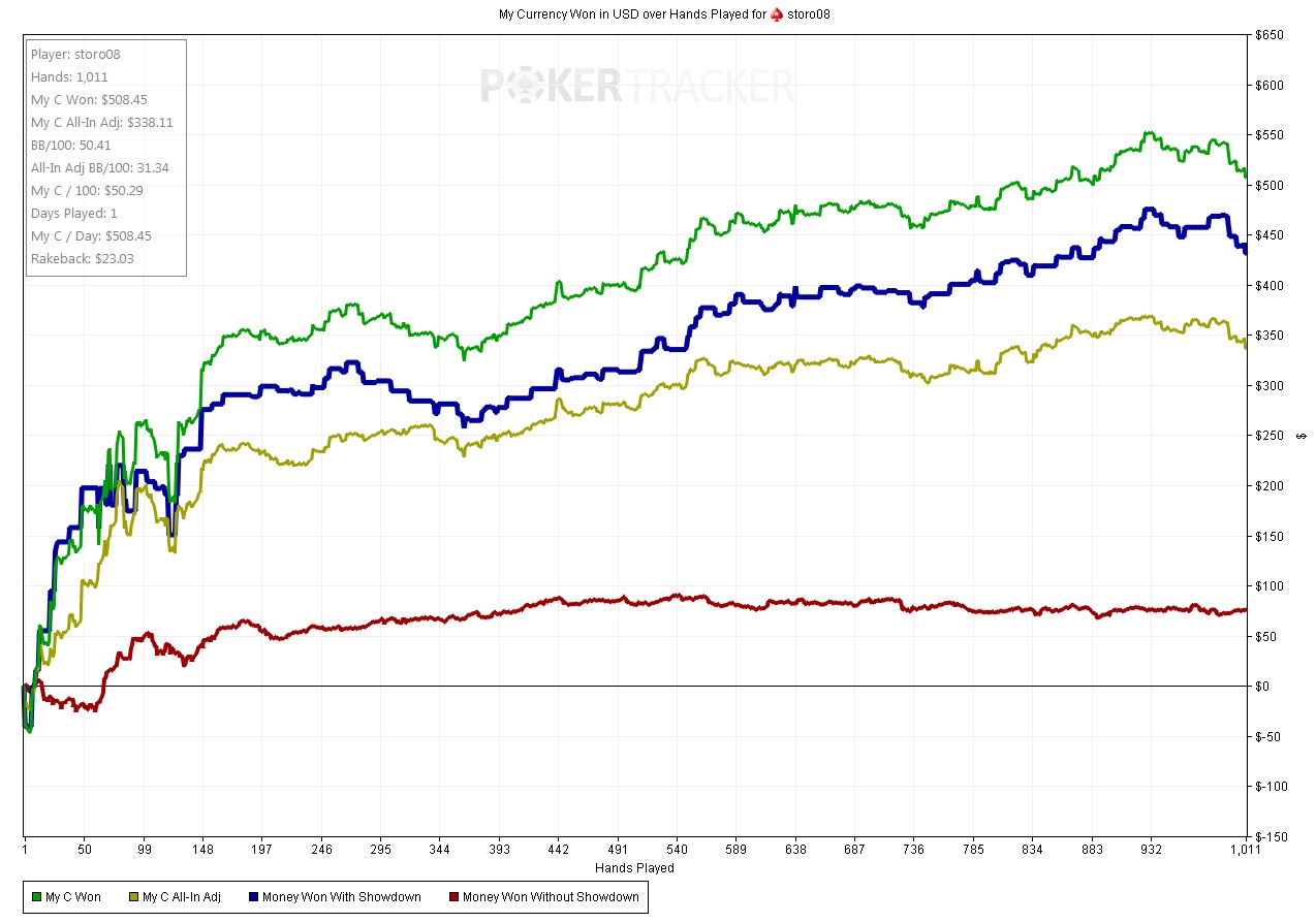 ![]() Отыграл 4 турика хэдзап гипертурбо по 10.2$, в двух итм на 71 бакс. К сожалению глубоко в этот раз не где пройти не удалось. Ну и катнул сессию кэша, рук 400 побамхантил NL100 пока игра не развалилась ввиду проигрышей рыбы и порядка 600 рук в NL50. Вышло неплохо с передачкой. Приятно так. За последние 5 дней вышел даже небольшой минус хотя играл относительно плотно где-то 16к рук+ эти турики. А затем два дня и плюс порядка 850$. Отдало. ![]() Выкину сюда немного раздач чтоле, развлечь читающих блог) Это был один из самых глупых блефов вечера. PokerStars - $0.50 NL FAST (2 max) - Holdem - 2 players Hand converted by PokerTracker 4 Hero (SB): 185.6 BB BB: 84.78 BB (VPIP: 0.00, PFR: 0.00, 3Bet Preflop: -, Hands: 1) Hero posts SB 0.5 BB, BB posts BB 1 BB Pre Flop: (pot: 1.5 BB) Hero has A T Hero raises to 2 BB, BB calls 1 BB Flop: (4 BB, 2 players) J 2 2 BB checks, Hero checks Turn: (4 BB, 2 players) A BB bets 7 BB, Hero calls 7 BB River: (18 BB, 2 players) 9 BB bets 11 BB and is all-in, Hero calls 11 BB and is all-in BB shows Q 7 (One Pair, Twos) (Pre 33%, Flop 20%, Turn 0%)Hero shows A T (Two Pair, Aces and Twos) (Pre 67%, Flop 80%, Turn 100%)Hero wins 39 BB Пассивность это зло в покере, поставь опп ривер я б легко сдался. Но так опп решил сыграть ещё более-глупо объявил фолд в позе на мой чек. Забавно. PokerStars - $0.50 NL FAST (2 max) - Holdem - 2 players Hand converted by PokerTracker 4 SB: 75.78 BB (VPIP: 100.00, PFR: 0.00, 3Bet Preflop: 0.00, Hands: 1) Hero (BB): 146.9 BB SB posts SB 0.5 BB, Hero posts BB 1 BB Pre Flop: (pot: 1.5 BB) Hero has 3 K SB raises to 2 BB, Hero calls 1 BB Flop: (4 BB, 2 players) A 2 4 Hero checks, SB bets 2 BB, Hero calls 2 BB Turn: (8 BB, 2 players) T Hero checks, SB checks River: (8 BB, 2 players) J Hero checks, fold Hero wins 7.64 BB Увидя такие турн и ривер после колла пуша, я уже понятное дело понял, что банк с большой вероятностью не мой. Но нет же и тут опп какую - то херню запушил. PokerStars - $0.50 NL FAST (2 max) - Holdem - 2 players Hand converted by PokerTracker 4 Hero (SB): 111.9 BB BB: 56.84 BB (VPIP: 82.35, PFR: 44.12, 3Bet Preflop: 15.00, Hands: 34) Hero posts SB 0.5 BB, BB posts BB 1 BB Pre Flop: (pot: 1.5 BB) Hero has 7 6 Hero raises to 2 BB, BB raises to 3 BB, Hero calls 1 BB Flop: (6 BB, 2 players) 7 5 4 BB bets 17 BB and is all-in, Hero calls 17 BB and is all-in Turn: (40 BB, 2 players) A River: (40 BB, 2 players) 5 BB shows 4 Q (Two Pair, Fives and Fours) (Pre 56%, Flop 19%, Turn 19%)Hero shows 7 6 (Two Pair, Sevens and Fives) (Pre 44%, Flop 81%, Turn 81%)Hero wins 39 BB Человек наверное читает мой блог, я уже не раз писал, что девочка на танке это железобетонный натс. PokerStars - $1 NL FAST (2 max) - Holdem - 2 players Hand converted by PokerTracker 4 Hero (SB): 100 BB BB: 49.72 BB Hero posts SB 0.5 BB, BB posts BB 1 BB Pre Flop: (pot: 1.5 BB) Hero has A 3 Hero raises to 2 BB, BB calls 1 BB Flop: (4 BB, 2 players) 7 Q T BB checks, Hero bets 1.45 BB, BB calls 1.45 BB Turn: (6.9 BB, 2 players) 7 BB checks, Hero bets 4.55 BB, BB calls 4.55 BB River: (16 BB, 2 players) 2 BB checks, Hero bets 12 BB and is all-in, BB calls 12 BB and is all-in Hero shows A 3 (Flush, Ace High) (Pre 63%, Flop 97%, Turn 91%)BB mucks Q 2 (Two Pair, Queens and Sevens) (Pre 37%, Flop 3%, Turn 9%)Hero wins 39.5 BB Вообщем день неплохой. Всегда приятно заканчивать в плюс на несколько сотен баксов играя при этом мало. Чего и всем читающим меня желаю. И да кстати, все кто читает, знаю такие есть, но стесняются регится на форуме и что-то комментить, так вот давайте регайтесь! ![]() |
