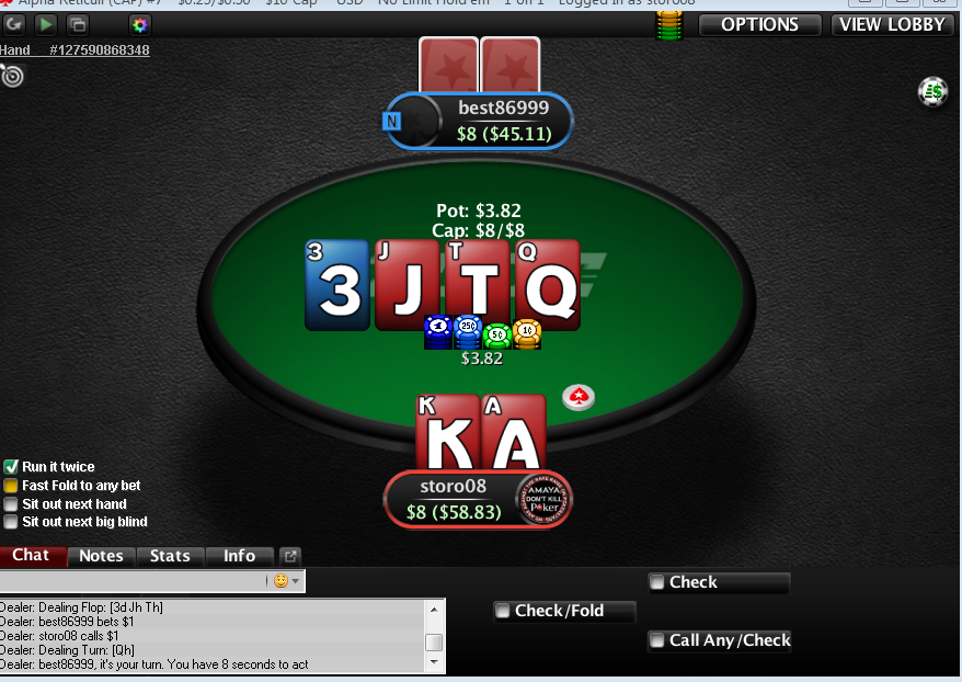Grabbed byHoldem Manager NL Holdem $60(BB) Poker Stars Hero ($9,680) BB ($8,605) UTG ($10,090) UTG+1 ($9,970) UTG+2 ($10,685) MP1 ($20,590) MP2 ($11,220) CO ($11,760) BTN ($9,905) Dealt to Hero J A fold, fold, fold, fold, fold, CO raises to $159, fold, Hero raises to $499, fold, CO calls $340 FLOP ($1,058) A 2 Q Hero bets $420, CO calls $420 TURN ($1,898) A 2 Q T Hero bets $999, CO raises to $2,199, Hero folds CO wins $3,896 Рисует 2 пары плюс, хрен знает можно и проколить, но обычно тут 2 пары плюс. Хоттер по 11 аут 419 место из 11 тысяч чел, итм 3 баина. В см стек 7612. Пока всё идёт по сценарию когда последний раз мтт играл тут. ![]() |