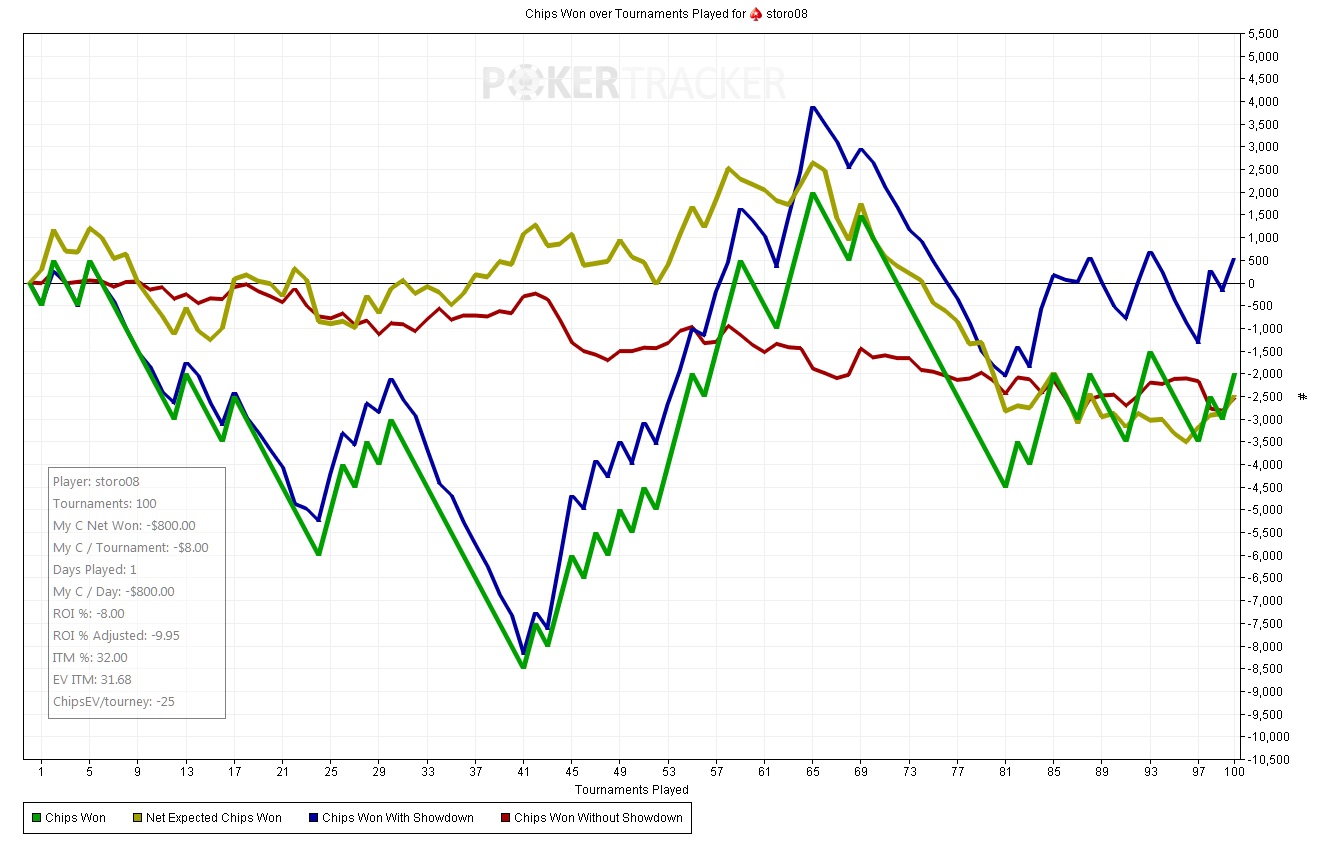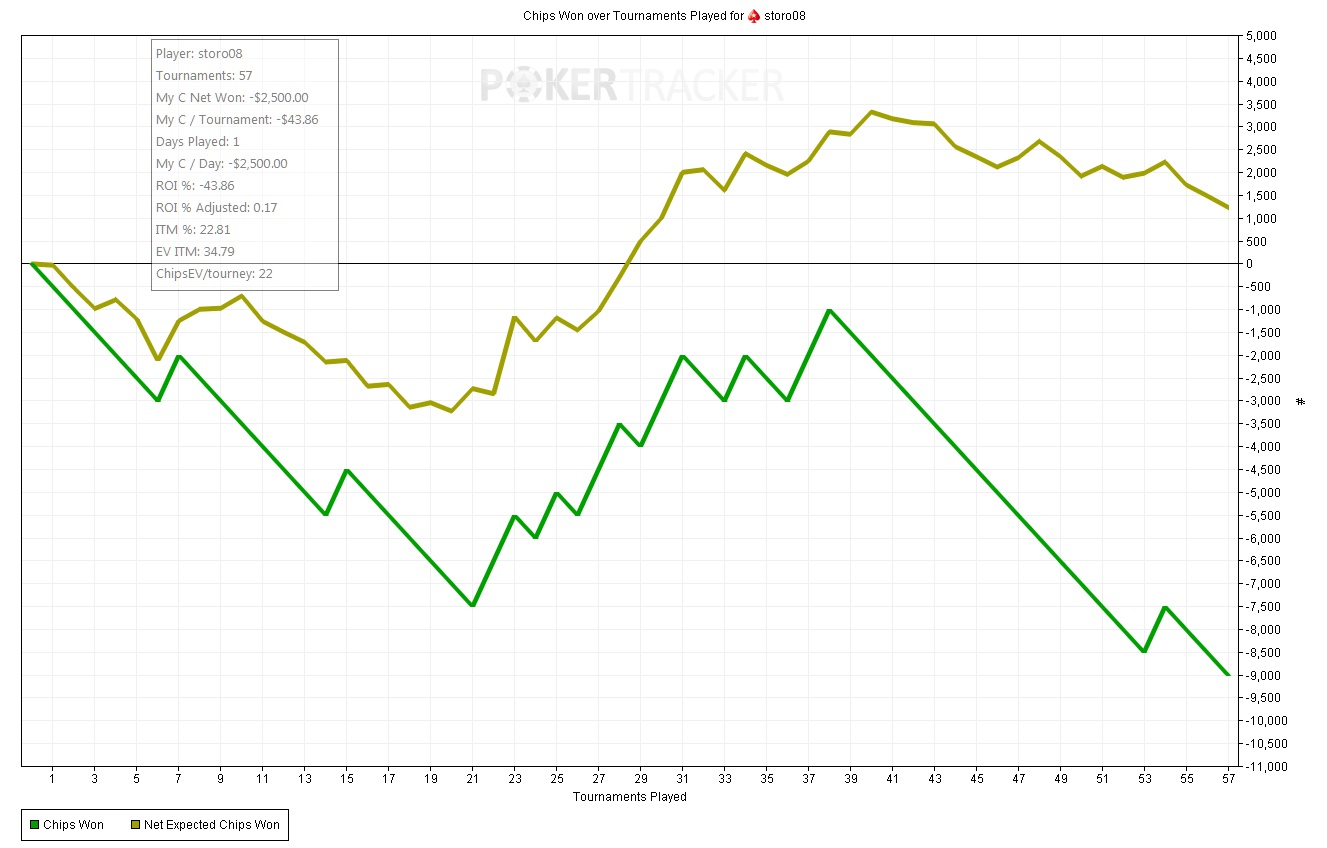 Очередной говнодень. Такое сладкое поле, а выиграть ничего невозможно, любой мудак как угодно выигрывает, и подставы постоянные. Самое обидное такие проигрывать, это чудо перед этим в сухие доски баррелило что-то раза 4 я падал и тут опять лепит, я понимал что скорее всего каре, с любым другим регом я бы ещё на турне сфолдил, но с этим чудилой есс-но не выкинул. Там конечно натс. PokerStars - $95+$5|10/20 NL (3 max) - Holdem - 3 players Hand converted by PokerTracker 4 storo08 (SB): 28 BB hyperDONK618 (BB): 24.5 BB Tolgforss (BTN): 22.5 BB storo08 posts SB 0.5 BB, hyperDONK618 posts BB 1 BB Pre Flop: (pot: 1.5 BB) storo08 has K 3 fold, storo08 calls 0.5 BB, hyperDONK618 checks Flop: (2 BB, 2 players) K 5 5 storo08 checks, hyperDONK618 bets 1.5 BB, storo08 calls 1.5 BB Turn: (5 BB, 2 players) 5 storo08 checks, hyperDONK618 bets 6.5 BB, storo08 calls 6.5 BB River: (18 BB, 2 players) A storo08 checks, hyperDONK618 bets 15.5 BB and is all-in, storo08 calls 15.5 BB hyperDONK618 shows 6 5 (Four of a Kind, Fives)(Pre 45%, Flop 91%, Turn 100%) storo08 shows K 3 (Full House, Fives full of Kings)(Pre 55%, Flop 9%, Turn 0%) hyperDONK618 wins 49 BB Ну и куча таких раздач, хорошо попадаешь, но оппу идут катящиеся и потом он с тебя добирает. Или ты сам с себя добираешь. PokerStars - $95+$5|15/30 NL (3 max) - Holdem - 2 players Hand converted by PokerTracker 4 storo08 (SB): 28.17 BB ludenking (BB): 21.83 BB storo08 posts SB 0.5 BB, ludenking posts BB 1 BB Pre Flop: (pot: 1.5 BB) storo08 has 8 2 storo08 calls 0.5 BB, ludenking checks Flop: (2 BB, 2 players) 9 2 8 ludenking checks, storo08 bets 1.5 BB, ludenking calls 1.5 BB Turn: (5 BB, 2 players) Q ludenking checks, storo08 bets 2.5 BB, ludenking calls 2.5 BB River: (10 BB, 2 players) 6 ludenking checks, storo08 bets 5.5 BB, ludenking calls 5.5 BB storo08 shows 8 2 (Two Pair, Eights and Twos)(Pre 25%, Flop 67%, Turn 5%) ludenking shows Q 8 (Two Pair, Queens and Eights)(Pre 75%, Flop 33%, Turn 95%) ludenking wins 21 BB Или не пойми что играют и потом ещё добирают. PokerStars - $95+$5|10/20 NL (3 max) - Holdem - 3 players Hand converted by PokerTracker 4 storo08 (BB): 23 BB dumbastar (BTN): 18.8 BB Kelboy82 (SB): 33.2 BB Kelboy82 posts SB 0.5 BB, storo08 posts BB 1 BB Pre Flop: (pot: 1.5 BB) storo08 has 8 K fold, Kelboy82 raises to 2 BB, storo08 calls 1 BB Flop: (4 BB, 2 players) 2 K 3 Kelboy82 checks, storo08 bets 2 BB, Kelboy82 calls 2 BB Turn: (8 BB, 2 players) 2 Kelboy82 bets 8 BB, storo08 calls 8 BB River: (24 BB, 2 players) 4 Kelboy82 bets 21.2 BB and is all-in, storo08 calls 11 BB and is all-in Kelboy82 shows A 5 (Straight, Five High)(Pre 61%, Flop 28%, Turn 16%) storo08 shows 8 K (Two Pair, Kings and Twos)(Pre 39%, Flop 72%, Turn 84%) Kelboy82 wins 46 BB И тут вроде нельзя никак выкинуть. PokerStars - $95+$5|10/20 NL (3 max) - Holdem - 3 players Hand converted by PokerTracker 4 storo08 (BTN): 25 BB realstaff (SB): 25 BB NadnarwiankA (BB): 25 BB realstaff posts SB 0.5 BB, NadnarwiankA posts BB 1 BB Pre Flop: (pot: 1.5 BB) storo08 has T J storo08 raises to 2 BB, fold, NadnarwiankA calls 1 BB Flop: (4.5 BB, 2 players) A 2 T NadnarwiankA checks, storo08 bets 2 BB, NadnarwiankA calls 2 BB Turn: (8.5 BB, 2 players) T NadnarwiankA bets 3.3 BB, storo08 calls 3.3 BB River: (15.1 BB, 2 players) K NadnarwiankA bets 6 BB, storo08 calls 6 BB NadnarwiankA shows J Q (Straight, Ace High)(Pre 69%, Flop 28%, Turn 9%) storo08 mucks T J (Three of a Kind, Tens)(Pre 31%, Flop 72%, Turn 91%) NadnarwiankA wins 27.1 BB Это первые попавшиеся раздачи из отмеченных, таких тут полно, делаешь всё правильно, а фишки едут в другую сторону. На сотках всего отыграл я около 9к игр, в плюсе только с рейкбеком. Игру усилил, ну и поле как по мне очень сладкое и простое, также как и по 60, очень удивлён, что не у одного рега на большой дистанции тут нет 60 фишек с турнира. Может говнорум как-то подкручивает ? =) Скорее всего мы наблюдаем начало краха старзовской империи, поэтому нужно пока катать вовсю, сегодня весь день были дела и домой приехал только вечером, уже подуставший, кое-как отыграл одну сотню, сделав всего 1 ошибку из-за усталости. А так как получится поиграть свежим, буду играть побольше. Кстати общался с приятелем, он тут сотки покатывает, так у него за 2500 спинов, профит около 33000$, при чем максимум падало 3 штуки х25, и две из них он выиграл, остальное набито на х10 х6 и х4. Но там по ев перебор конечно, хотя и играет лучше половины тамошних регов. Такая дисперсия тут) А у меня пока постоянно недобор, плюс ещё и по ев стрик. Итог дня: -800$ |