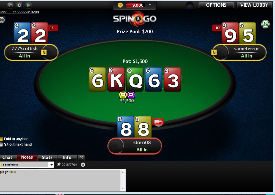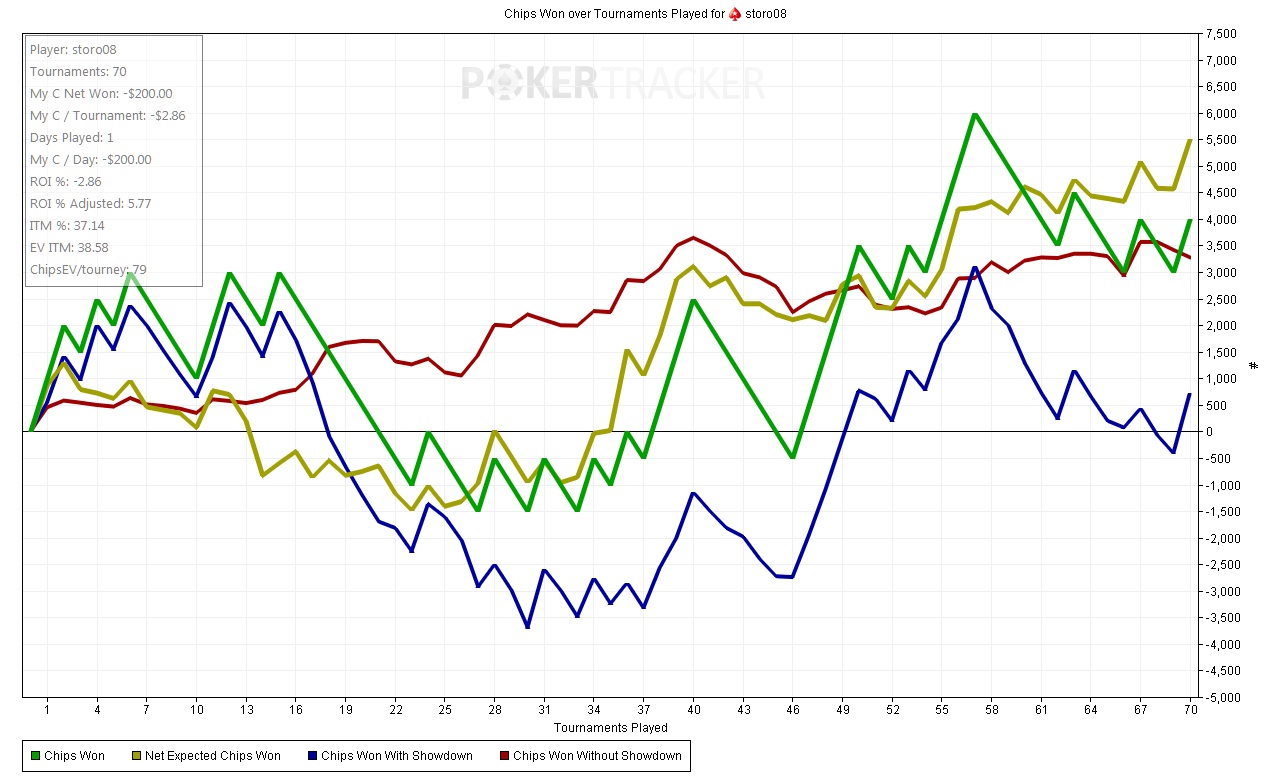 Выложу немного рук с последней сессии. В целом всё довольно плохо, т.к. чудовищно заходит в обоих румах. Тут как будто рег. Можно было ривер не колить, но этот опп часто чудит.PokerStars - $95+$5|10/20 NL (3 max) - Holdem - 3 playersHand converted by PokerTracker 4vitjeslav (BTN): 470 pokerzysta90 (SB): 550storo08 (BB): 480pokerzysta90 posts SB 10, storo08 posts BB 20 Pre Flop: (pot: 30) storo08 has A  A fold, pokerzysta90 raises to 40, storo08 raises to 90, pokerzysta90 calls 50 Flop: (180, 2 players) 2  K  3 pokerzysta90 checks, storo08 bets 60, pokerzysta90 calls 60 Turn: (300, 2 players) 5 pokerzysta90 bets 80, storo08 calls 80 River: (460, 2 players) K pokerzysta90 bets 320 and is all-in, storo08 calls 250 and is all-in pokerzysta90 shows Q  J  (Flush, King High) (Pre 19%, Flop 68%, Turn 84%) storo08 shows A  A  (Two Pair, Aces and Kings) (Pre 81%, Flop 32%, Turn 16%) pokerzysta90 wins 960 Залез на флоп с мелким ручником, попал как следует, но дальше гавно какое-то.PokerStars - $95+$5|10/20 NL (3 max) - Holdem - 2 playersHand converted by PokerTracker 4nico0503 (SB): 645storo08 (BB): 855nico0503 posts SB 10, storo08 posts BB 20 Pre Flop: (pot: 30) storo08 has 2  2 nico0503 raises to 40, storo08 calls 20 Flop: (80, 2 players) J  2  A storo08 checks, nico0503 bets 40, storo08 raises to 110, nico0503 calls 70 Turn: (300, 2 players) 7 storo08 bets 180, nico0503 calls 180 River: (660, 2 players) 6 storo08 bets 525 and is all-in, nico0503 calls 315 and is all-in storo08 shows 2  2  (Three of a Kind, Twos) (Pre 50%, Flop 69%, Turn 82%) nico0503 shows Q  A  (Flush, Ace High) (Pre 50%, Flop 31%, Turn 18%) nico0503 wins 1,290 С этим оппом вообще незнаю, что делать, перебирает только в хедзап тысяч 10 фишек. Любую комбинацию рисует и демонстрирует, когда я колю когда выкидывать нельзя. По почерку игры похож на ученика тамошней гто школы. На ривере я думал : "а ну иди сюда!" Winning Poker Network (Yatahay) - 30/60 NL (3 max) - Holdem - 2 playersHand converted by PokerTracker 4spin2win2win (BB): 720Billy Bakster (SB): 780Billy Bakster posts SB 30, spin2win2win posts BB 60 Pre Flop: (pot: 90) Billy Bakster has T  A Billy Bakster calls 30, spin2win2win raises to 150, Billy Bakster calls 90 Flop: (300, 2 players) 3  8  7 spin2win2win checks, Billy Bakster checks Turn: (300, 2 players) 3 spin2win2win bets 150, Billy Bakster calls 150 River: (600, 2 players) A spin2win2win bets 420 and is all-in, Billy Bakster calls 420 spin2win2win shows 9  3  (Three of a Kind, Threes) (Pre 30%, Flop 73%, Turn 100%) Billy Bakster shows T  A  (Two Pair, Aces and Threes) (Pre 70%, Flop 27%, Turn 0%) spin2win2win wins 1,440 И вот когда серию таких сдач сдают, то как-то неприятно.Winning Poker Network (Yatahay) - 20/40 NL (3 max) - Holdem - 2 playersHand converted by PokerTracker 4Ralphini (SB): 650Billy Bakster (BB): 850Ralphini posts SB 20, Billy Bakster posts BB 40 Pre Flop: (pot: 60) Billy Bakster has K  K Ralphini raises to 80, Billy Bakster raises to 179, Ralphini calls 99 Flop: (358, 2 players) 5  2  3 Billy Bakster bets 120, Ralphini raises to 240, Billy Bakster calls 120 Turn: (838, 2 players) 2 Billy Bakster checks, Ralphini bets 231 and is all-in, Billy Bakster calls 231 River: (1,300, 2 players) 9 Ralphini shows A  A  (Two Pair, Aces and Twos) (Pre 82%, Flop 91%, Turn 95%) Billy Bakster shows K  K  (Two Pair, Kings and Twos) (Pre 18%, Flop 9%, Turn 5%) Ralphini wins 1,300 Короче тяжело всё, очень тяжело.