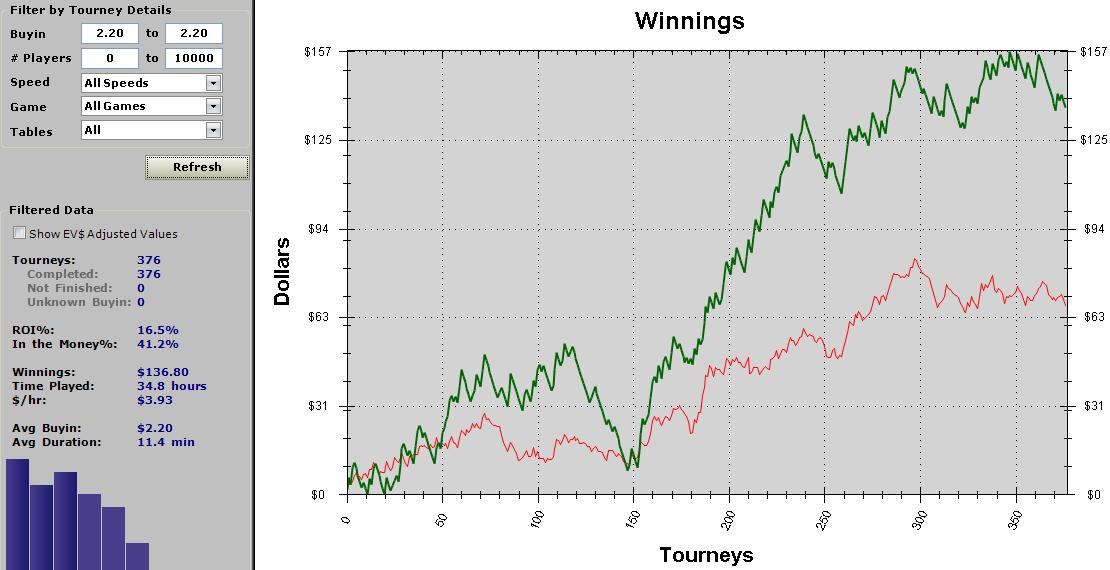 В супертурбинах за 2,20 результаты пока радуют:До вчерашнего дня РОИ был под 20%, но вчера отыграл около 60 турниров в ноль, и РОИ сразу упал. Но и этот результат для меня - неожиданность. Всегда считал супертурбо лотереей и просто не верил, что можно их играть в плюс. Хотя красная линия на графике идет ниже основной; тут не исключен и откат. Поживем - увидим! В любом случае, этот лимит меня поразил обилием оппов, которые ну совсем не понимают, что творят (тут в норме закрывать оллин с полным стеком в начальной стадии турнира на 9Ts или K7o :scared:). Пробивая по шарку регов, пока обнаружил только двоих, кто на дистанции играет в ноль. Подавляющее большинство же - в минус. В общем, пока я тут задержусь. Хочу набить дистанцию побольше и посмотреть на результаты. Если дело пойдет, будем подниматься на лимит повыше.