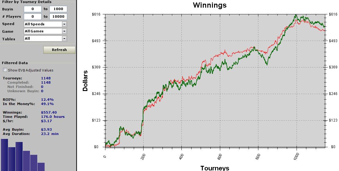 Ах, да. Вдогонку... Забыл поделиться одним наблюдением по поводу красной линии (luck adjusted) в СнГ. Что-то она совсем обнаглела. :))) Вчера сливаю койн за койном, переездов хватает, а она, зараза, еще и ниже зеленой прёт. Типа, если бы не мой "лак" :lol: , было бы еще хуже. Посмотрел по некоторым раздачам. Яркий пример: осталось трое с приблизительно одинаковыми стеками. Выставляемся с одним префлоп, у меня ТТ, у него АК (ситуация 57/43). Выбиваю его. Через несколько раздач с оставшимся оппом выставляемся - у меня 77, у него 49о. Я выигрываю турнир. Зеленая линия идет, как и положено, строго вверх, а красная - с какого-то перепугу - под 45 градусов вниз. Наверное, то, что я выиграл с 77 против 49о - это дикое везение... :? :lol: До этого в турнире я никого не переезжал, и такой её выкрутас мне совсем не понятен. :? Может, тут действуют какие-то другие принципы её построения или я просто не знаю толком, что она означает?