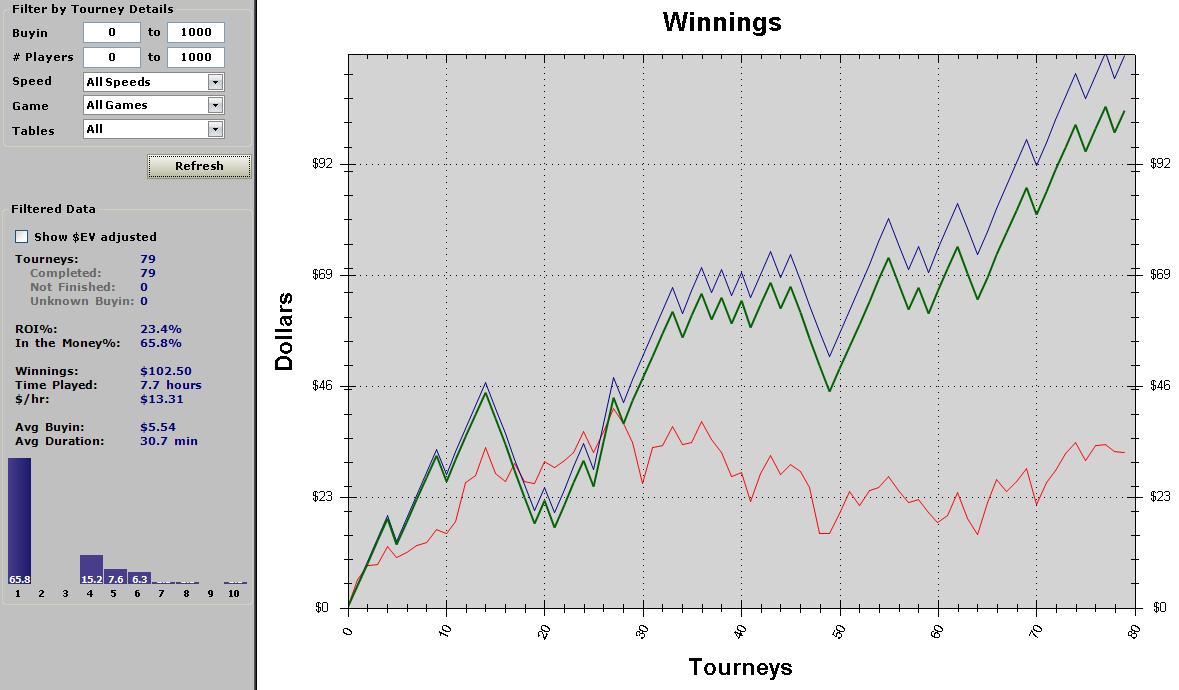 CO ($1,500) BTN ($2,785) Dealt to Hero A  K fold, fold, fold, fold, Hero raises to $910 (AI), fold, fold, fold, BB calls $760FLOP ($1,985) 9  3  7 TURN ($1,985) 9  3  7  5 RIVER ($1,985) 9  3  7  5  2 Hero shows A  K (Pre 45%, Flop 3.6%, Turn 0.0%) BB shows 9  9 (Pre 55%, Flop 96.4%, Turn 100.0%) BB wins $1,985 А как вам вот это?: Недодача за 27 последних туриков 75 баксов - это почти по 3 бакса за турнир (это при байине 5 баксов!).  Сказка... Наверное, так проявляется паранойя, но меня сейчас вполне серьезно терзает мысль, уж не написать ли письмо в саппорт, отправить скан графика с просьбой как-то проверить работу ГСЧ. Да, понимаю, что это бредово, да, по-детски, но мысль-то от этого не улетучивается... Ладно, 56 баксов - это абсолютно не катастрофа, всё равно по месяцу неплохой плюс идет. Будем играть и наблюдать дальше...