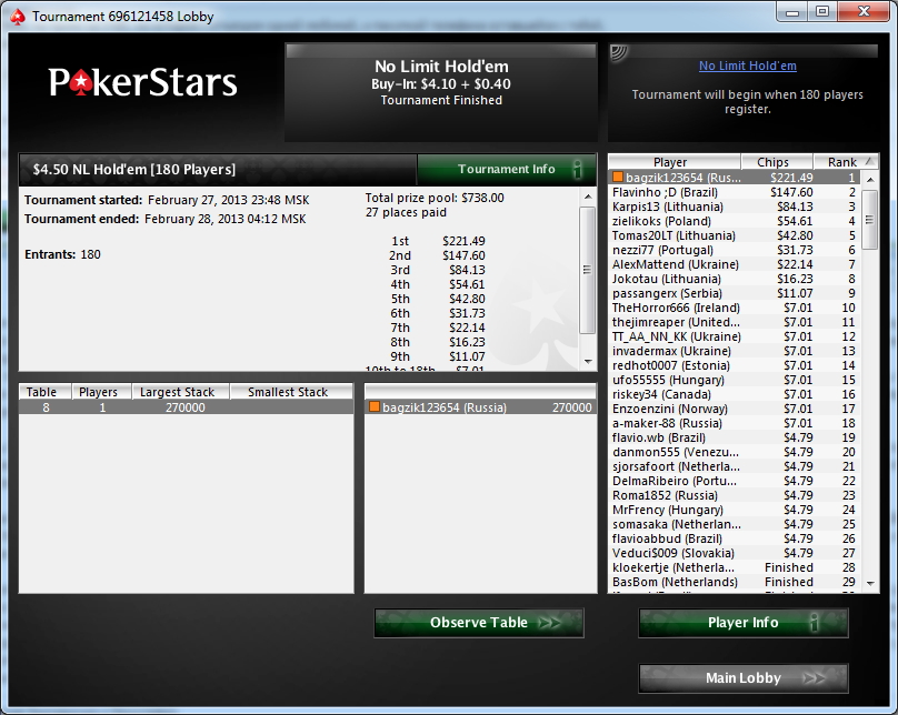 Зовут меня Влад, мне 22 года, живу в городе Липецк. Решил завести небольшой дневничек для более простого контроля над тем что я делаю в покере. Играть буду РАШ на 135чел за 4$. Играю иго уже больше месяца ша 600 туров держу рой около 80%. Хочется попробовать 11-ый лимит, но из-за постоянных кэшаутов не получается...да и пока 50к деревянных в месяц мне хватает) Цель до конца года набить 1,5-2к. График прилагается. Бр 800$ сегодня плюсанул 250$. После кэшаутов оставляю мин 600$. Последний раз редактировалось bagzik 08 янв 2012, 18:36, всего редактировалось 28 раз(а).