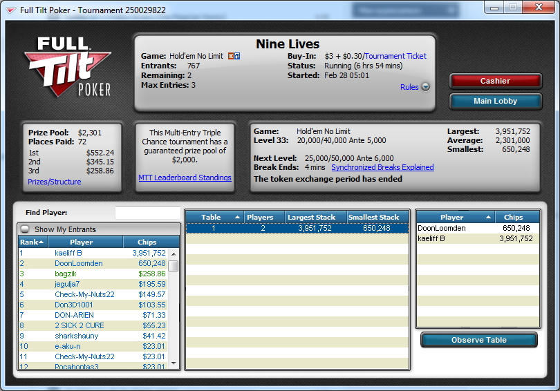 Full Tilt Poker Super Stack $4.5K Guarantee No Limit Hold'em Tournament - t3000/t6000 Blinds + t750 - 9 players - View hand 2117977