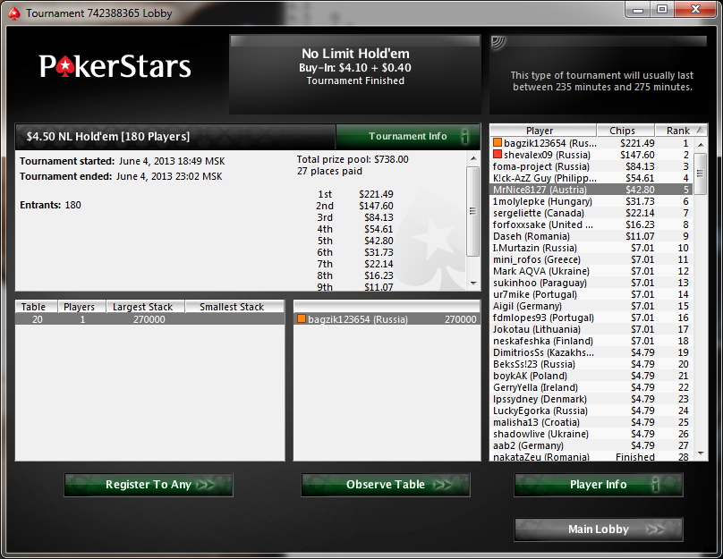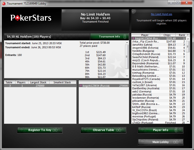 Зовут меня Влад, мне 22 года, живу в городе Липецк. Решил завести небольшой дневничек для более простого контроля над тем что я делаю в покере. Играть буду РАШ на 135чел за 4$. Играю иго уже больше месяца ша 600 туров держу рой около 80%. Хочется попробовать 11-ый лимит, но из-за постоянных кэшаутов не получается...да и пока 50к деревянных в месяц мне хватает) Цель до конца года набить 1,5-2к. График прилагается. Бр 800$ сегодня плюсанул 250$. После кэшаутов оставляю мин 600$. Последний раз редактировалось bagzik 08 янв 2012, 18:36, всего редактировалось 28 раз(а).