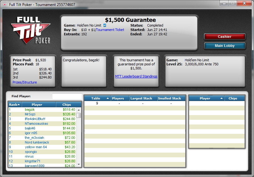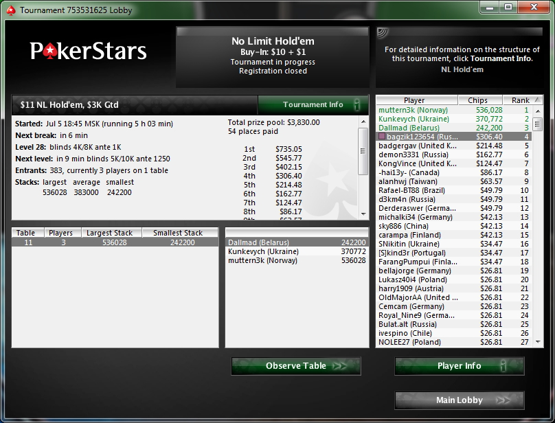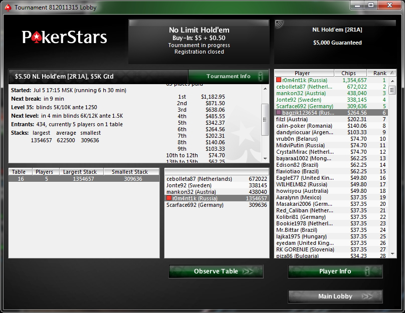 Зовут меня Влад, мне 22 года, живу в городе Липецк. Решил завести небольшой дневничек для более простого контроля над тем что я делаю в покере. Играть буду РАШ на 135чел за 4$. Играю иго уже больше месяца ша 600 туров держу рой около 80%. Хочется попробовать 11-ый лимит, но из-за постоянных кэшаутов не получается...да и пока 50к деревянных в месяц мне хватает) Цель до конца года набить 1,5-2к. График прилагается. Бр 800$ сегодня плюсанул 250$. После кэшаутов оставляю мин 600$. Последний раз редактировалось bagzik 08 янв 2012, 18:36, всего редактировалось 28 раз(а).
