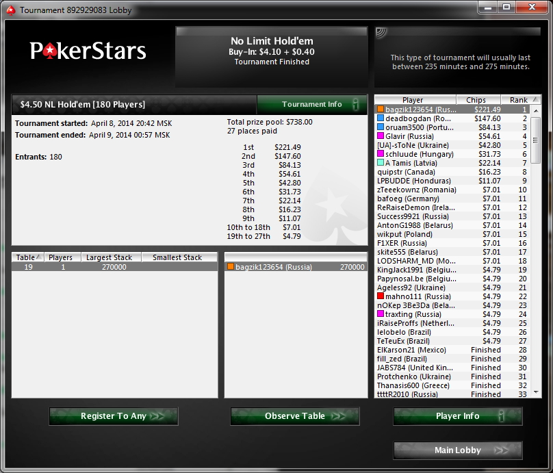 Играю под пивко турик за сотку и пара раздач против чела 42/0 $10/$20 No Limit Holdem OnGame 8 Players Hand Conversion Powered by weaktight.com Stacks: UTG realAbulFadl ( $9,660) 483bb UTG+1 liamk1d ( $10,000) 500bb MP1 grona79 ( $10,000) 500bb MP2 ClownChief ( $9,920) 496bb CO PerRing ( $9,900) 495bb BTN Phemo86 ($9,858) 493bb SB rutsi ($10,662) 533bb BB bagzik ($10,000) 500bb Pre-Flop: ( $30, 8 players) bagzik is BB 10  8 5 folds, Phemo86 raises to $60, rutsi calls $50, bagzik calls $40 Flop: 2  6  10  ( $180, 3 players) rutsi bets $50, bagzik calls $50, Phemo86 calls $50 Turn: 8  ( $330, 3 players) rutsi bets $75, bagzik raises to $225, Phemo86 folds, rutsi calls $150 River: 9  ( $780, 2 players) rutsi bets $375, bagzik calls $375 Final Pot: $1,530 rutsi shows STRAIGHT TEN 7  7 rutsi wins $1,530 (net + $820) bagzik lost $710 Phemo86 lost $110$15/$30 No Limit Holdem OnGame 8 Players Hand Conversion Powered by weaktight.com Stacks: UTG PerRing ($9,900) 330bb UTG+1 Phemo86 ( $9,173) 306bb MP1 rutsi ($11,482) 383bb MP2 bagzik ($9,320) 311bb CO realAbulFadl ($11,845) 395bb BTN liamk1d ( $9,955) 332bb SB grona79 ( $8,405) 280bb BB ClownChief ( $9,920) 331bb Pre-Flop: ( $45, 8 players) bagzik is MP2 10  10 PerRing raises to $100, 1 fold, rutsi calls $100, bagzik calls $100, realAbulFadl calls $100, 3 folds Flop: Q  K  Q  ( $445, 4 players) PerRing checks, rutsi bets $90, bagzik calls $90, 1 fold, PerRing calls $90 Turn: 10  ( $715, 3 players) PerRing checks, rutsi bets $90, bagzik raises to $330, PerRing folds, rutsi calls $240 River: 9  ( $1,375, 2 players) rutsi checks, bagzik bets $600, rutsi raises to $1,200, bagzik calls $600 Final Pot: $3,775 rutsi shows STRAIGHT_FLUSH KING J  K rutsi wins $3,775 (net + $2,055) bagzik lost $1,720 realAbulFadl lost $100 PerRing lost $190